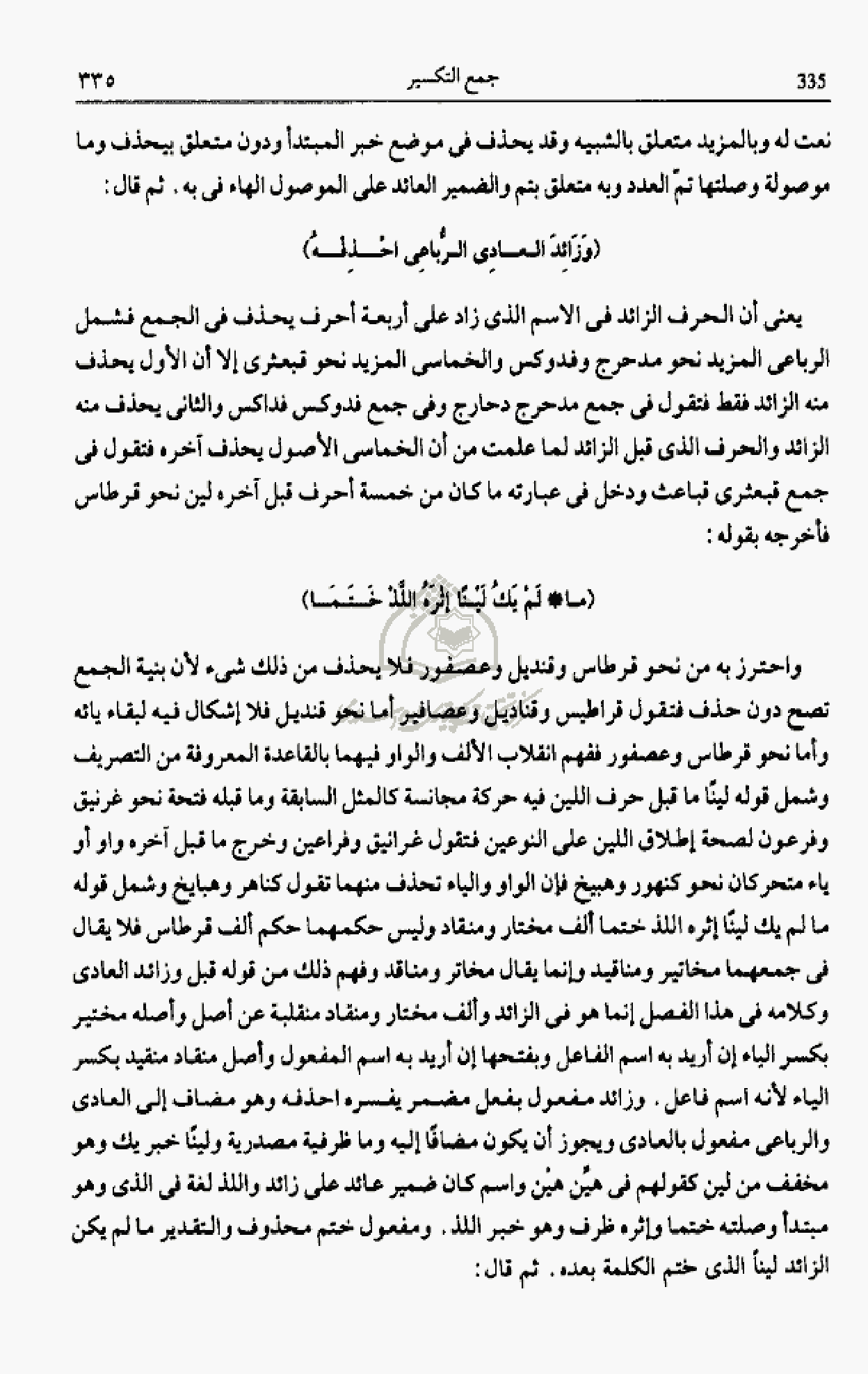 وفدوكس والخماسى المزيد نحو قبعثرى إلا أن الأول يحذف منه الزائد فقط فتقول فى جمع مدحرج دحارج وفى جمع فدوكس فداكس والثانى يحذف منه الزائد والحرف الذى قبل الزائد لما علمت من أن الخماسى الأصول يحذف آخره فتقول فى جمع قبعثرى قباعث ودخل فى عبارته ما كان من خمسة أحرف قبل آخره لين نحو قرطاس فأخرجه بقوله: