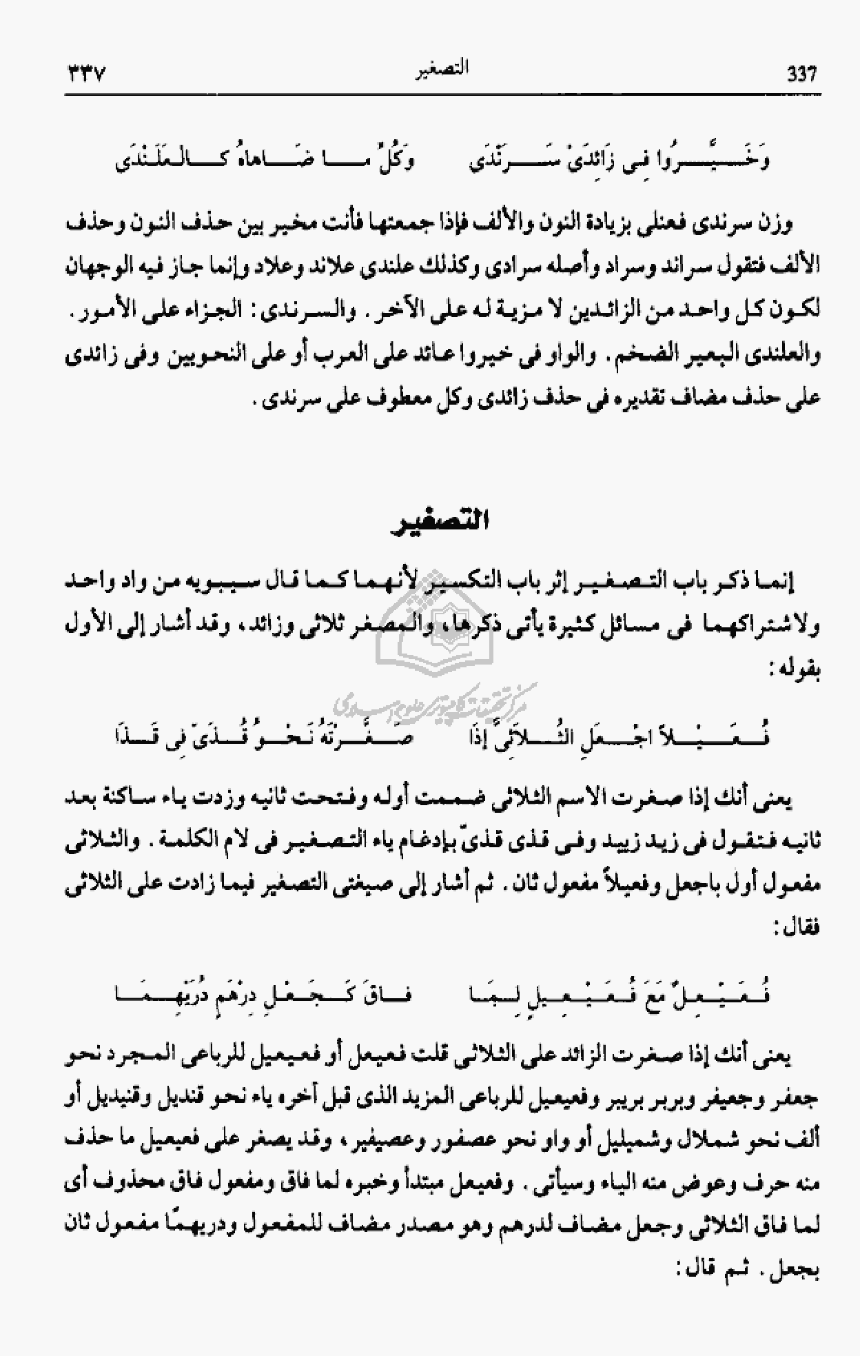 إنما ذكر باب التصغير إثر باب التكسير لأنهما كما قال سيبويه من واد واحد ولاشتراكهما فى مسائل كثيرة يأتى ذكرها، والمصغر ثلاثى وزائد، وقد أشار إلى الأول بقوله: