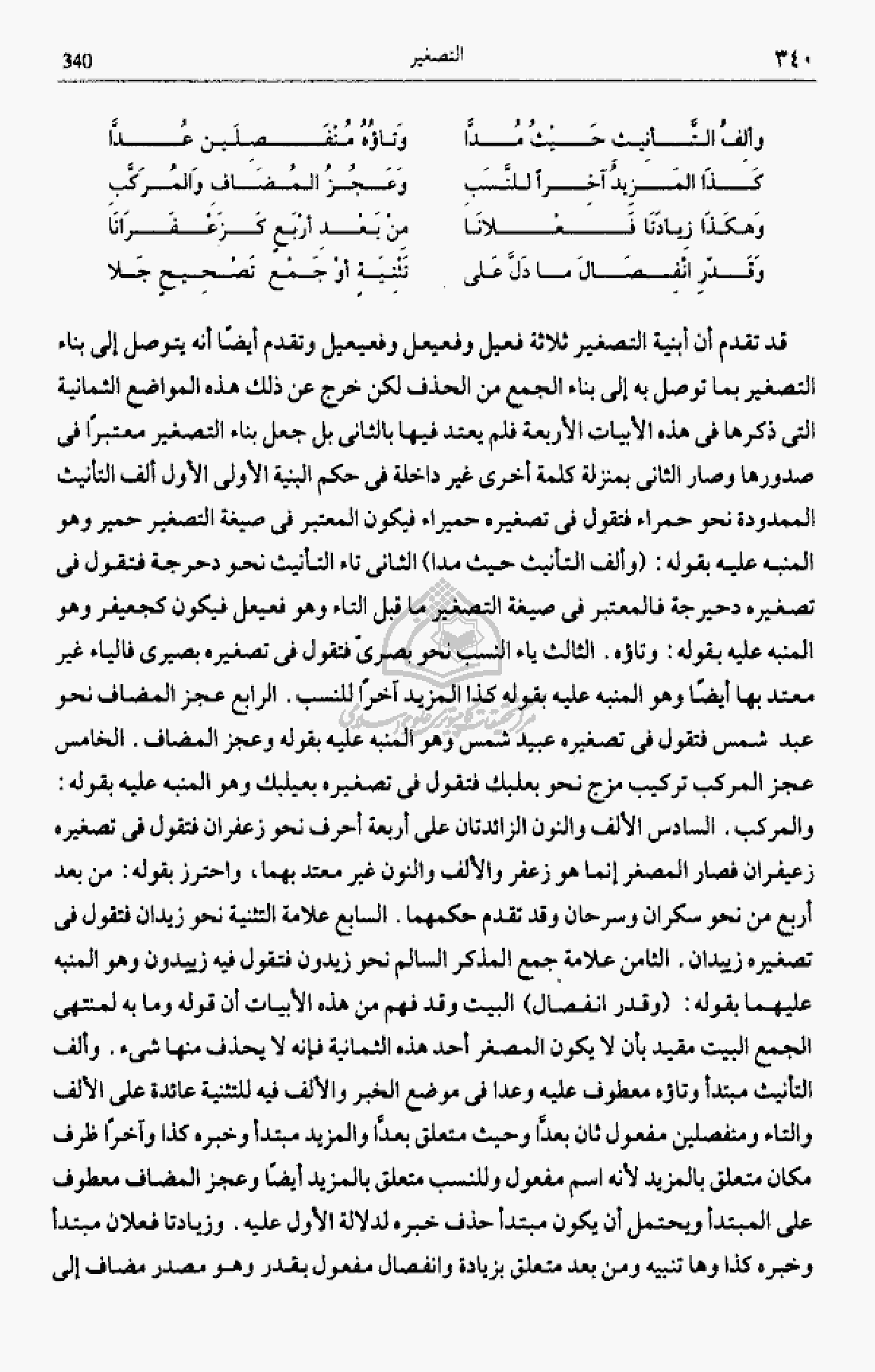 والمركب. السادس الألف والنون الزائدتان على أربعة أحرف نحو زعفران فتقول فى تصغيره زعيفران فصار المصغر إنما هو زعفر والألف والنون غير معتد بهما، واحترز بقوله: من بعد أربع من نحو سكران وسرحان وقد تقدم حكمهما. السابع علامة التثنية نحو زيدان فتقول فى تصغيره زييدان. الثامن علامة جمع المذكر السالم نحو زيدون فتقول فيه زييدون وهو المنبه عليهما بقوله: (وقدر انفصال) البيت وقد فهم من هذه الأبيات أن قوله وما به لمنتهى الجمع البيت مقيد بأن لا يكون المصغر أحد هذه الثمانية فإنه لا يحذف منها شئ. وألف التأنيث مبتدأ وتاؤه معطوف عليه وعدا فى موضع الخبر والألف فيه للتثنية عائدة على الألف والتاء ومنفصلين مفعول ثان بعدّا وحيث متعلق بعدّا والمزيد مبتدأ وخبره كذا وآخرا ظرف مكان متعلق بالمزيد لأنه اسم مفعول وللنسب متعلق بالمزيد أيضا وعجز المضاف معطوف على المبتدأ ويحتمل أن يكون مبتدأ حذف خبره لدلالة الأول عليه. وزيادتا فعلان مبتدأ وخبره كذا وها تنبيه ومن بعد متعلق بزيادة وانفصال مفعول بقدر وهو مصدر مضاف إلى