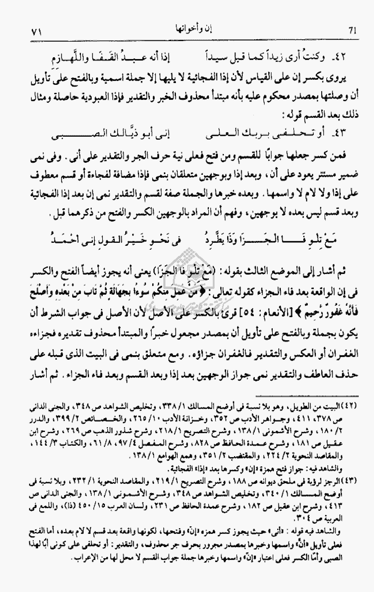 فمن كسر جعلها جوابا للقسم ومن فتح فعلى نية حرف الجر والتقدير على أنى. وفى نمى ضمير مستتر يعود على أن، وبعد إذا وبوجهين متعلقان بنمى فإذا مضافة لفجاءة أو قسم معطوف على إذا ولا لام لا واسمها. وبعده