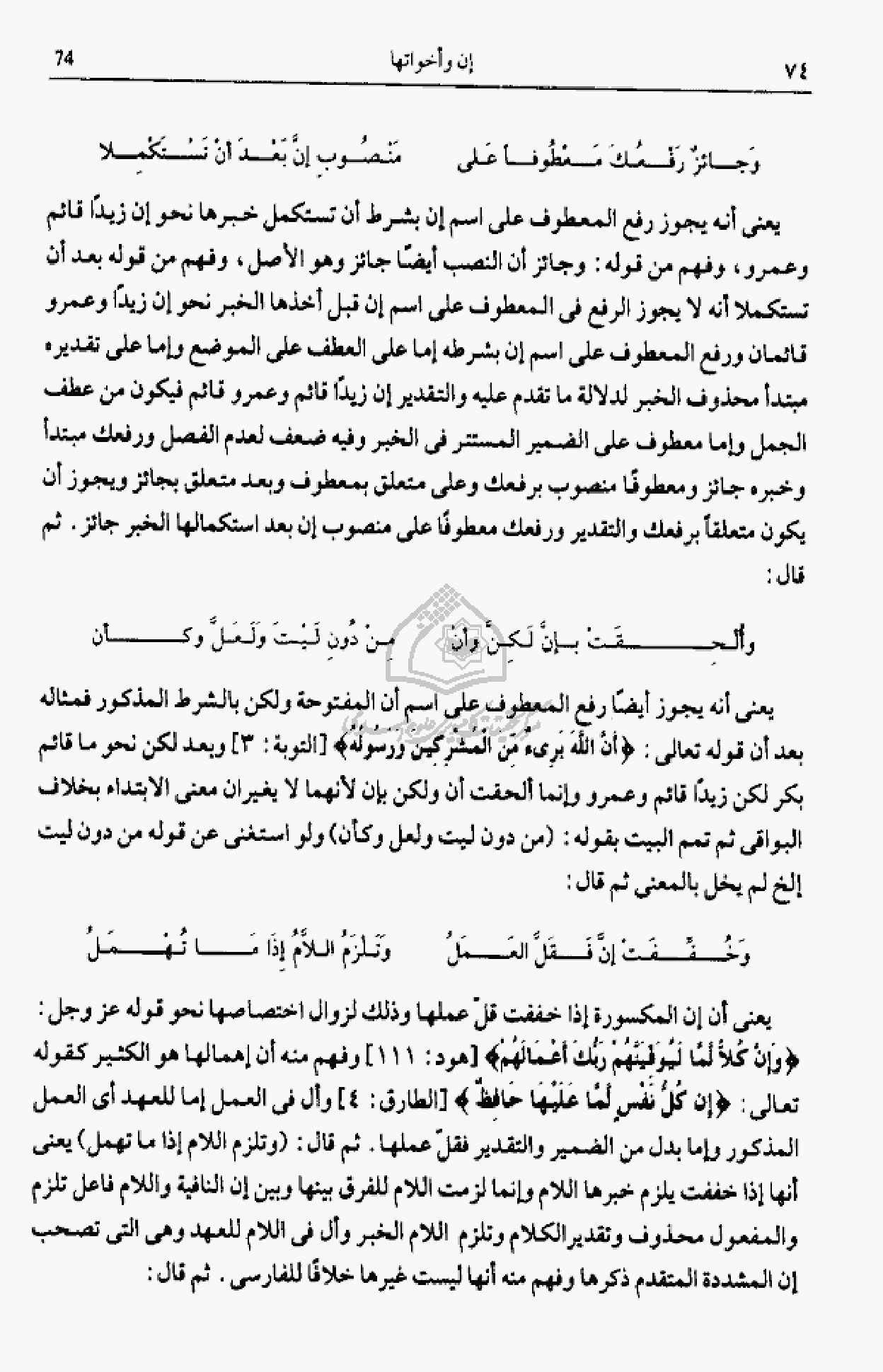 يعنى أنه يجوز أيضا رفع المعطوف على اسم أن المفتوحة ولكن بالشرط المذكور فمثاله بعد أن قوله تعالى: أَنَّ اللَّهَ بَرِيءٌ مِنَ الْمُشْرِكِينَ وَرَسُولُهُ [التوبة: 3] وبعد لكن نحو ما قائم بكر لكن زيدا قائم وعمرو وإنما ألحقت أن ولكن بإن لأنهما لا يغيران معنى الابتداء بخلاف البواقى ثم تمم البيت بقوله: (من دون ليت ولعل وكأن) ولو استغنى عن قوله من دون ليت إلخ لم يخل بالمعنى ثم قال:
