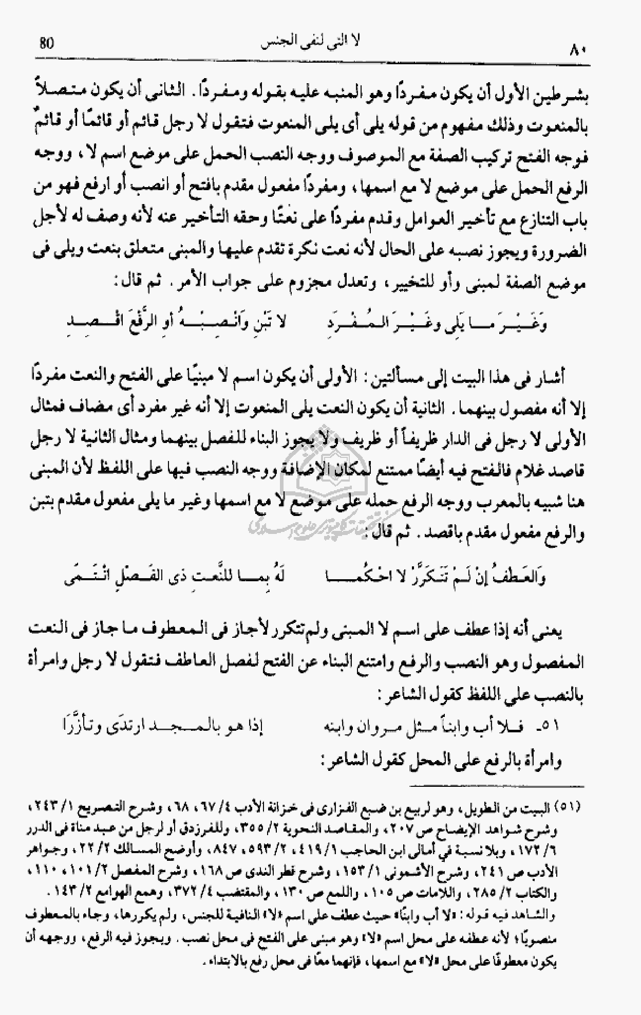 أشار فى هذا البيت إلى مسألتين: الأولى أن يكون اسم لا مبنيا على الفتح والنعت مفردا إلا أنه مفصول بينهما. الثانية أن يكون النعت يلى المنعوت إلا أنه غير مفرد أى مضاف فمثال الأولى لا رجل فى الدار ظريفا أو ظريف ولا يجوز البناء للفصل بينهما ومثال الثانية لا رجل قاصد غلام فالفتح فيه أيضا ممتنع لمكان الإضافة ووجه النصب فيها على اللفظ لأن المبنى هنا شبيه بالمعرب ووجه الرفع حمله على موضع لا مع اسمها وغير ما يلى مفعول مقدم بتبن والرفع مفعول مقدم باقصد. ثم قال: