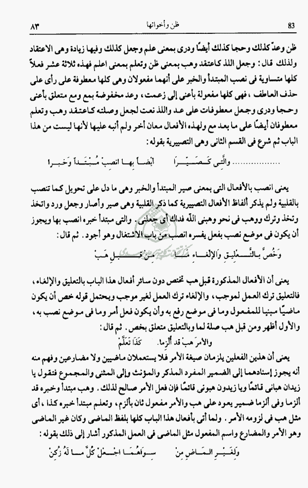 يعنى أن هذين الفعلين يلزمان صيغة الأمر فلا يستعملان ماضيين ولا مضارعين وفهم منه أنه يجوز إسنادهما إلى الضمير المفرد المذكر والمؤنث وإلى المثنى والمجموع فتقول يا زيدان هبانى قائما ويا زيدون هبونى قائما فإن فعل الأمر صالح لذلك. وهب مبتدأ وخبره قد ألزما وفى ألزما ضمير يعود على هب والأمر مفعول ثان بألزم، وتعلم مبتدأ خبره كذا، أى مثل هب فى لزومه الأمر. ولما أتى بأفعال هذا الباب كلها بلفظ الماضى وكان غير الماضى وهو الأمر والمضارع واسم المفعول مثل الماضى فى العمل المذكور أشار إلى ذلك بقوله: