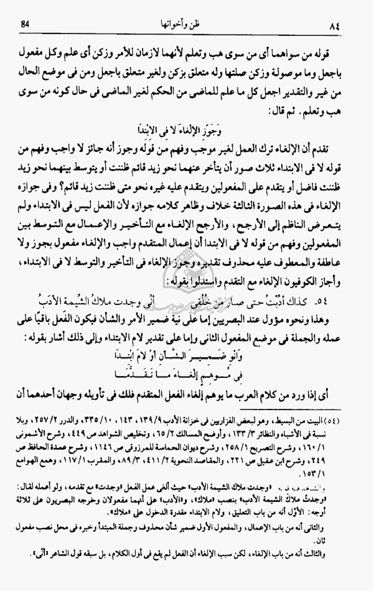 صور أن يتأخر عنهما نحو زيد قائم ظننت أو يتوسط بينهما نحو زيد ظننت فاضل أو يتقدم على المفعولين ويتقدم عليه غيره نحو متى ظننت زيد قائم؟ وفى جوازه الإلغاء فى هذه الصورة الثالثة خلاف وظاهر كلامه جوازه لأن الفعل ليس فى الابتداء ولم يتعرض الناظم إلى الأرجح، والأرجح الإلغاء مع التأخير والإعمال مع التوسط بين المفعولين وفهم من قوله لا فى الابتدا أن إعمال المتقدم واجب والإلغاء مفعول بجوز ولا عاطفة والمعطوف عليه محذوف تقديره وجوز الإلغاء فى التأخير والتوسط لا فى الابتداء، وأجاز الكوفيون الإلغاء مع التقدم واستدلوا بقوله:
