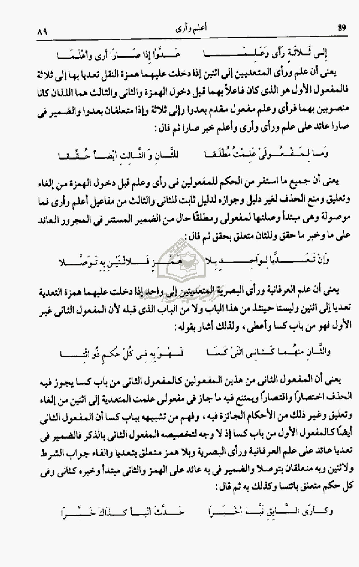 ويمتنع فيه ما جاز فى مفعولى علمت المتعدية إلى اثنين من إلغاء وتعليق وغير ذلك من الأحكام الجائزة فيه، وفهم من تشبيهه بباب كسا أن المفعول الثانى أيضا كالمفعول الأول من باب كسا إذ لا وجه لتخصيصه المفعول الثانى بالذكر فالضمير فى تعديا عائد على علم العرفانية ورأى البصرية وبلا همز متعلق بتعديا والفاء جواب الشرط ولاثنين وبه متعلقان بتوصلا والضمير فى به عائد على الهمز والثانى مبتدأ وخبره كثانى وفى كل حكم متعلق بائتسا وكذلك به ثم قال: