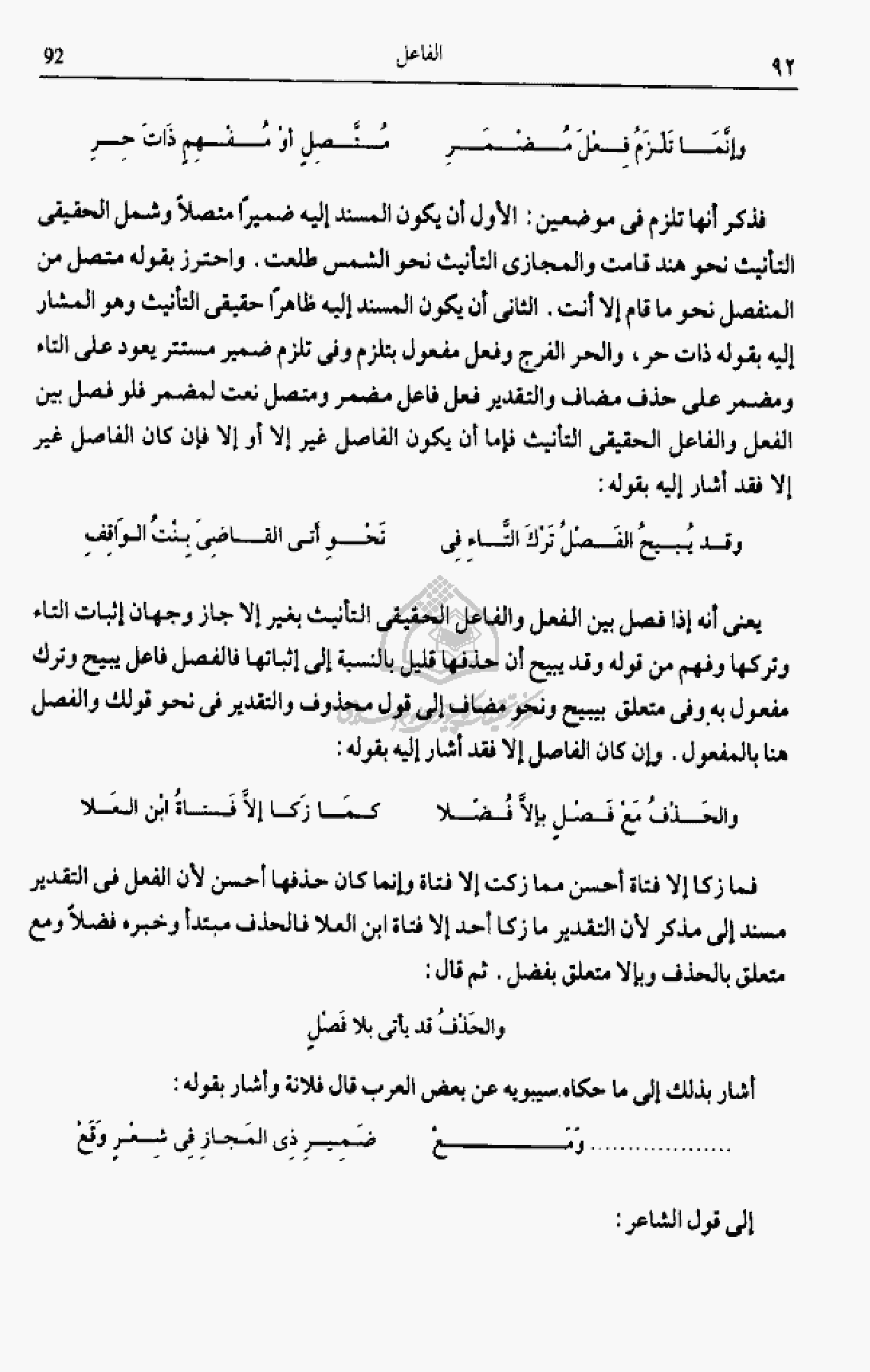 فذكر أنها تلزم فى موضعين: الأول أن يكون المسند إليه ضميرا متصلا وشمل الحقيقى التأنيث نحو هند قامت والمجازى التأنيث نحو الشمس طلعت. واحترز بقوله متصل من المنفصل نحو ما قام إلا أنت. الثانى أن يكون المسند إليه ظاهرا حقيقى التأنيث وهو المشار إليه بقوله ذات حر، والحر الفرج وفعل مفعول بتلزم وفى تلزم ضمير مستتر يعود على التاء ومضمر على حذف مضاف والتقدير فعل فاعل مضمر ومتصل نعت لمضمر فلو فصل بين الفعل والفاعل الحقيقى التأنيث فإما أن يكون الفاصل غير إلا أو إلا فإن كان الفاصل غير إلا فقد أشار إليه بقوله: