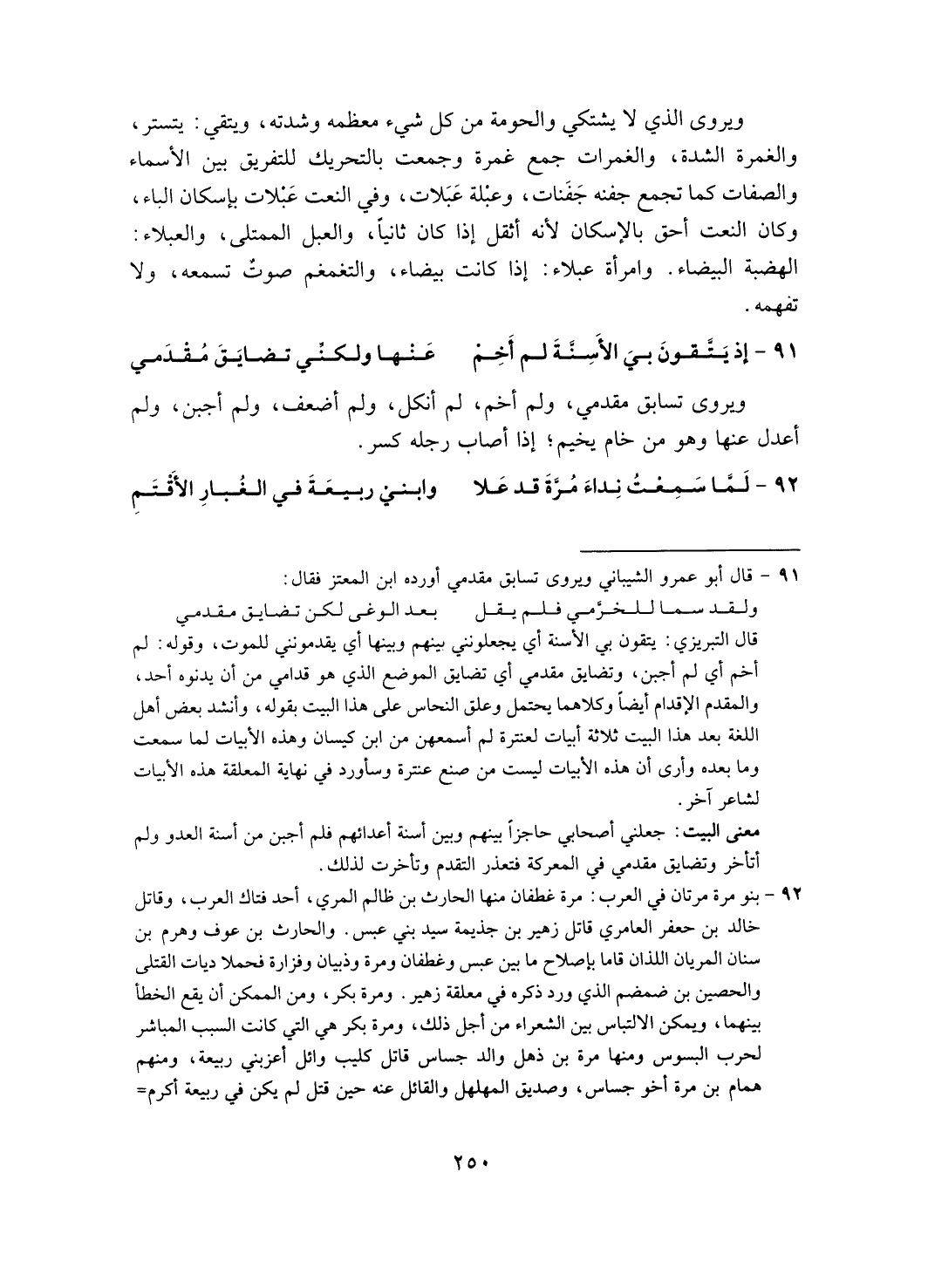 ويروى الذي لا يشتكي والحومة من كل شيء معظمه وشدته، ويتقيك يتستر، والغمرة الشدة، والغمرات جمع غمرة وجمعت بالتحريك للتفريق بين الأسماء والصفات كما تجمع جفنة جفنات، وعبلة عبلات، وفي النعت عبلات بإسكان الباء، وكان النعت أحق بالإسكان لأنه أثقل إذا كان ثانيا، والعبل الممتلى، والعبلاء: الهضبة البيضاء. وامرأة عبلاء: إذا كانت بيضاء، والتغمغم صوت تسمعه، ولا تفهمه.
