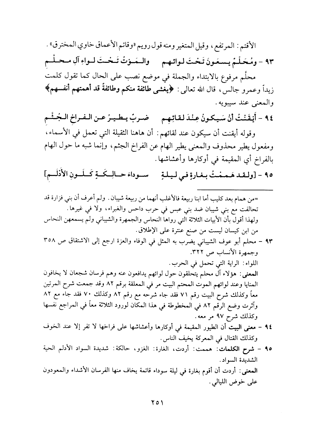 وقوله أيقنت أن سيكون عند لقائهم: أن ها هنا الثقيلة التي تعمل في الأسماء، ومفعول يطير محذوف والمعنى يطير الهام عن الفراخ الجثم، وإنما شبه ما حول الهام بالفراخ أي المقيمة في أوكارها وأعشاشها.