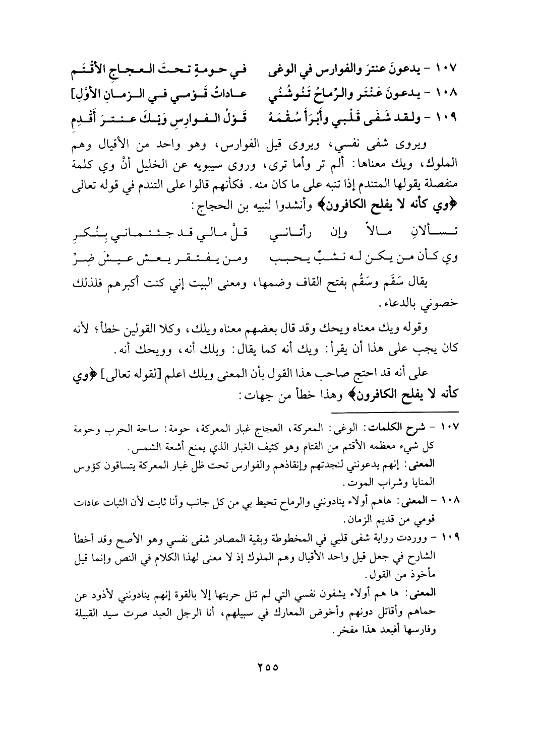 ويروى شفى نفسي، ويروى قيل الفوارس، وهو واحد من الأقيال وهم الملوك، ويك معناها: ألم تر وأما ترى، وروى سيبويه عن الخليل أن وي كلمة منفصلة يقولها المتندم إذا تنبه على ما كان منه. فكأنهم قالوا على التندم في قوله تعالى (وي كأنه لا يفلح الكافرون) وأنشدوا لنبيه بن الحجاج: