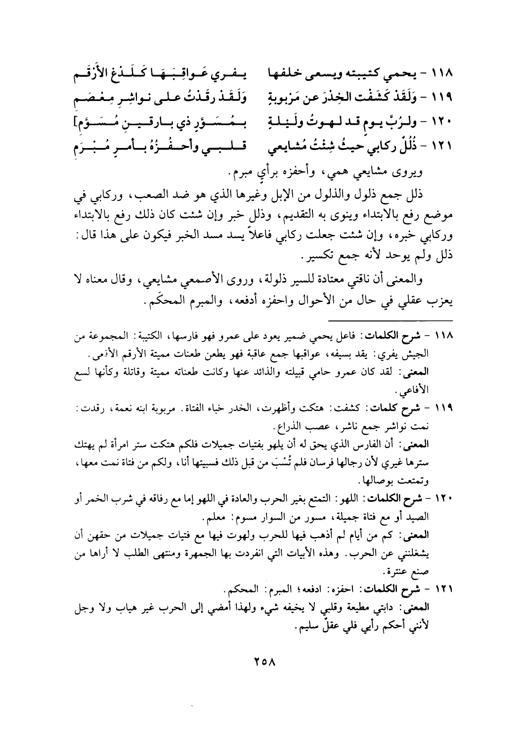 والمعنى أن ناقتي معتادة للسير ذلولة، وروى الأصمعي مشايعي، وقال معناه لا يعزب عقلي في حال من الأحوال واحفزه أدفعه، والمبرم المحكم.
