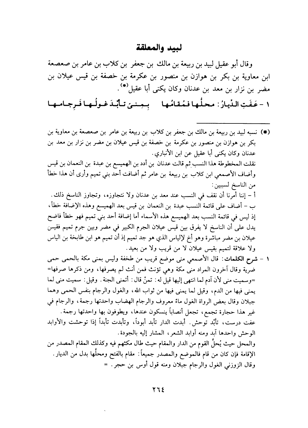 وقال أبو عقيل لبيد بن ربيعة بن مالك بن جعفر بن كلاب بن عامر بن صعصعة ابن معاوية بن بكر بن هوازن بن منصور بن عكرمة بن خصفة بن قيس عيلان بن مضر بن نزار بن معد بن عدنان وكان يكنى أبا عقيل.
