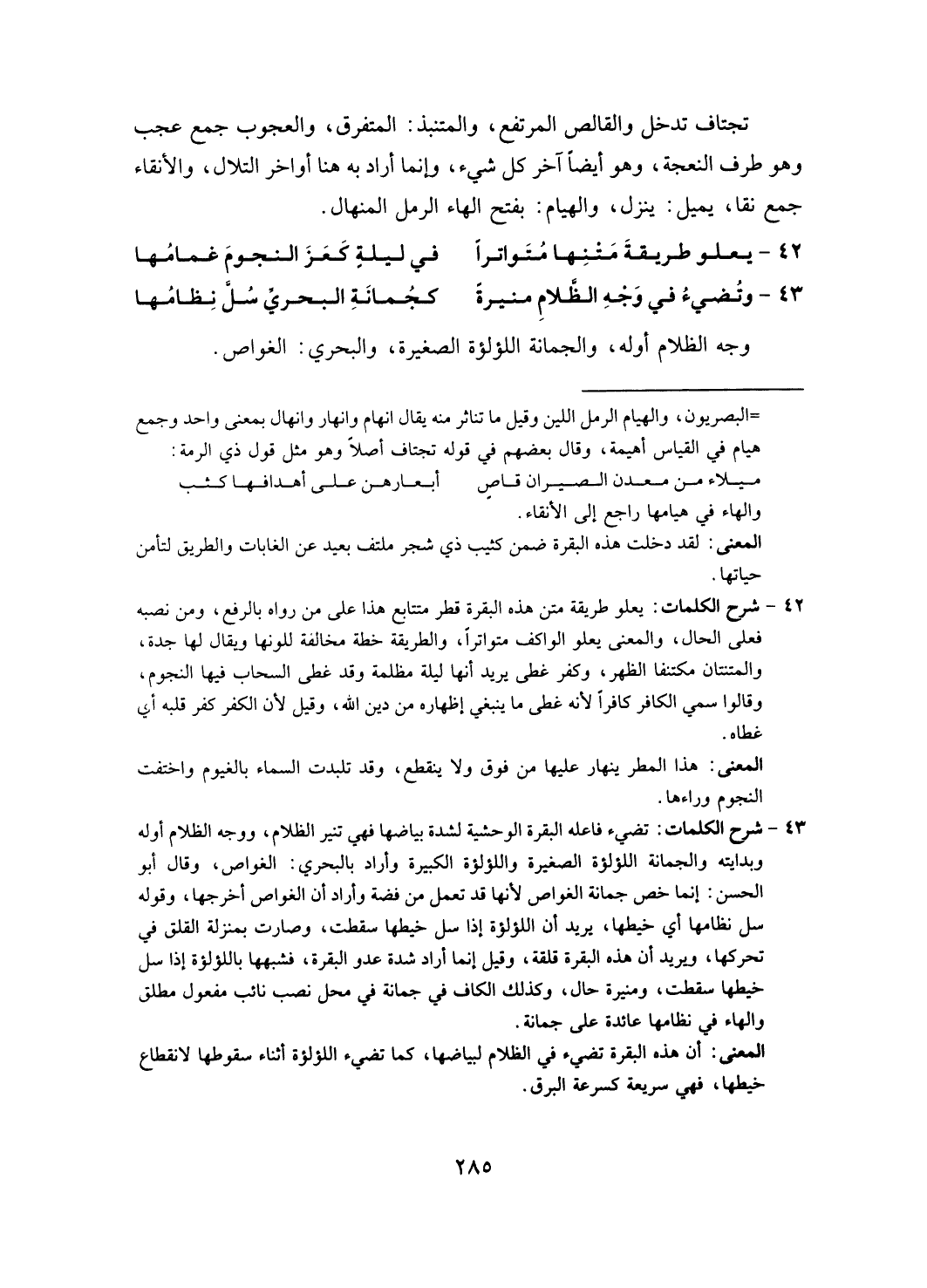 تجتاف تدخل والقالص المرتفع، والمتنبد: المتفرق، والعجوب جمع عجب وهو طرف النعجة، وهو أيضا آخر كل شيء، وإنما أراد به هنا أواخر التلال، والأنقاء جمع نقا، يميل: ينزل، والهيام: بفتح الهاء الرمل المنهال.