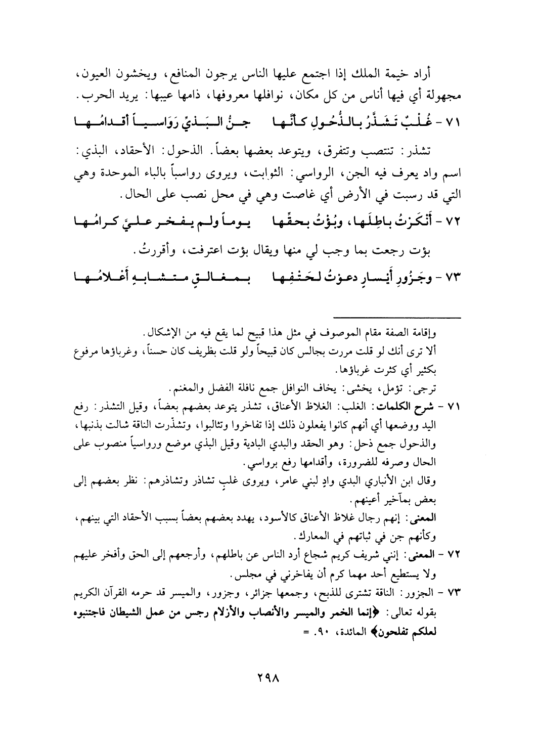 تشذر: تنتصب وتتفرق، ويتوعد بعضها بعضا. الذحول: الأحقاد، البذي: اسم واد يعرف الجن، الرواسي: الثوابت، ويروى رواسبا بالباء الموحدة وهي التي قد رسبت في الأرض أي غاصت وهي في محل نصب على الحال.