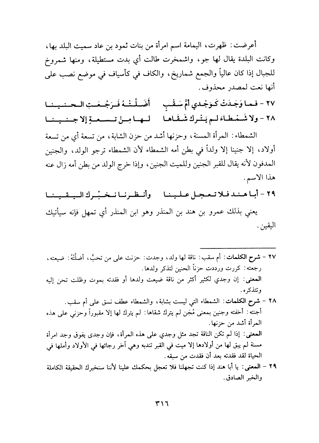 الشمطاء: المرأة المسنة، وحزنها من حزن الشابة، من تسعة أي من تسعة أولاد، إلا جنينا إلا ولدا في بطن أمه الشمطاء لأن الشمطاء ترجو الولد، والجنين المدفون لأنه يقال للقبر الجنين وللميت الجنين، وإذا خرج الولد من بطن أمه زال عنه هذا الاسم.