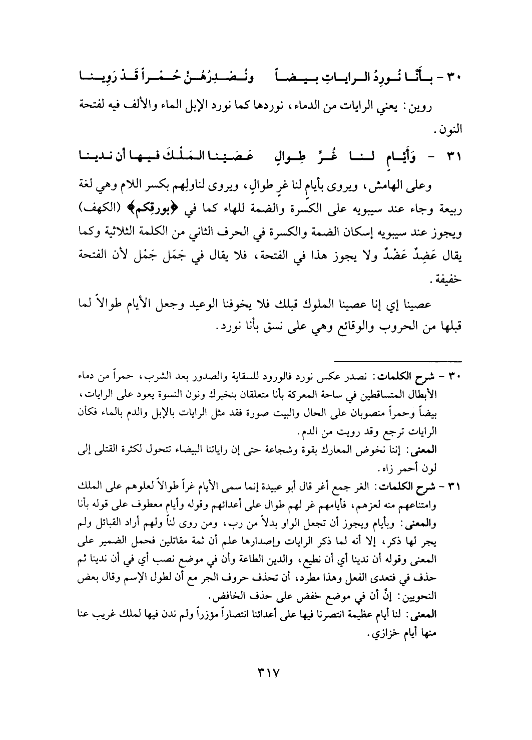 وعلى الهامش، ويروى بأيام لنا غير طوال، ويروى بكسر اللام وهي لغة ربيعة وجاء عند سيبويه على الكسرة والضمة للهاء كما في (بورقكم) (الكهف) ويجوز عند سيبويه إسكان الضمة والكسرة في الحرف الثاني من الكلمة الثلاثية وكما يقال عضد عضد ولا يجوز هذا في الفتحة، فلا يقال في جَمَل جَمل لأن الفتحة خفيفة.