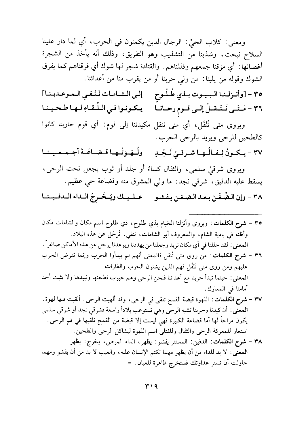 ومعنى: كلاب الحي: الرجال الذين يكمنون في الحرب، أي لما دار علينا السلاح نبحت، وشذبنا من التشذيب وهو التفريق، وذلك أنه يأخذ من الشجرة أغصانها: أي مزقنا جمعهم وذللناهم. والقتادة شجر لها شوك أي فرقناهم كما يفرق الشوك وقوله من يلينا: من ولي حربنا أو من يقرب منا من أعدائنا.
