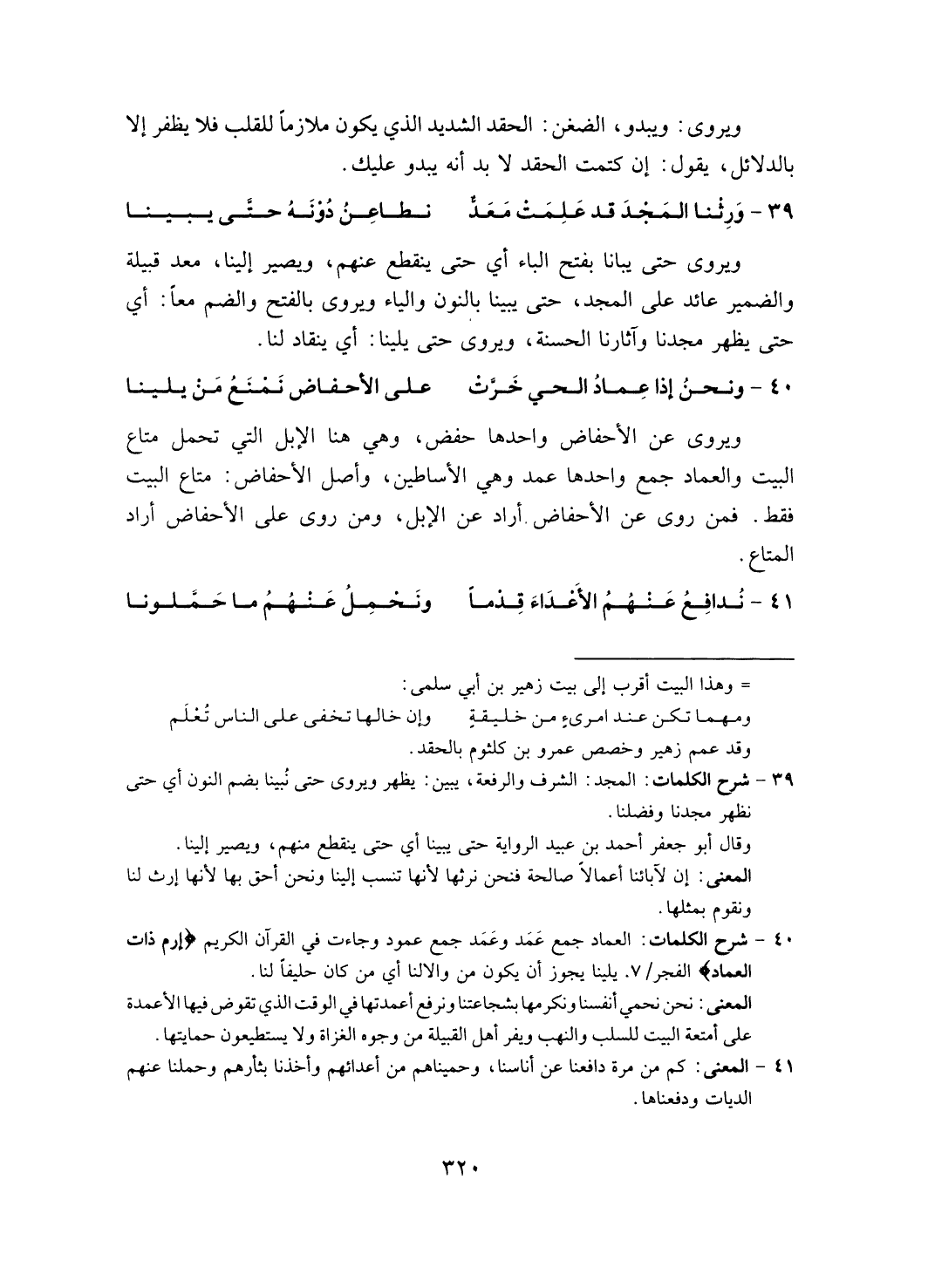 ويروى حتى بيانا بفتح الباء أي حتى ينقطع عنهم، ويصير إلينا، معد قبيلة والضمير عائد على المجد، حتى يبينا بالنون والياء ويروى بالفتح والضم معا: أي حتى يظهر مجدنا وآثارنا الحسنة، ويروى حتى يلينا: أي ينقاد لنا.
