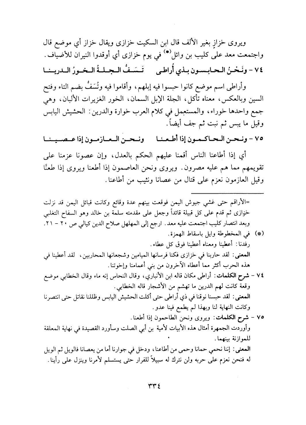 وأراطي اسم موضع كانوا حبسوا فيه إبلهم، وأقاموا فيه وتسف بضم التاء وفتح السين وبالعكس، معناه تأكل، الجلة الإبل السمان، الخور الغزيرات الألبان، وهي جمع واحدها خوراء، والمستعمل في كلام العرب خوارة والدرين: الحشيش اليابس وقيل ما يبس ثم نبت ثم جف أيضا.