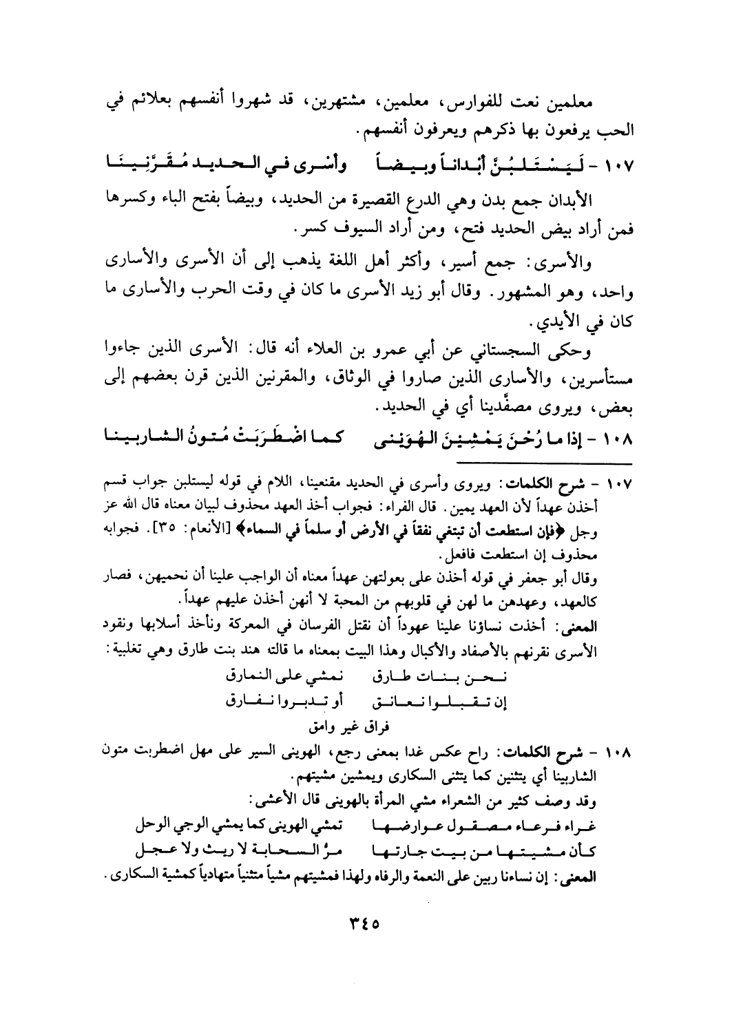وحكى السجستاني عن أبي عمرو بن العلاء أنه قال: الأسرى الذين جاءوا مستأسرين، والأسارى الذين صاروا في الوثاق، والمقرنين الذين قرن بعضهم إلى بعض، ويروى مصفدينا أي في الحديد.