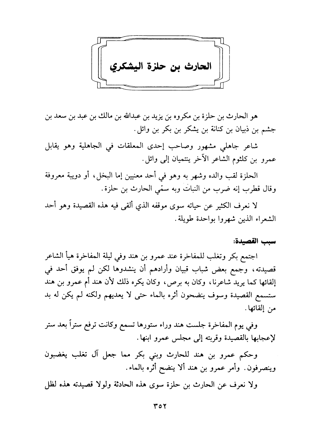 ولا نعرف عن الحارث بن حلزة سوى هذه الحادثة ولولا قصيدته هذه لظل