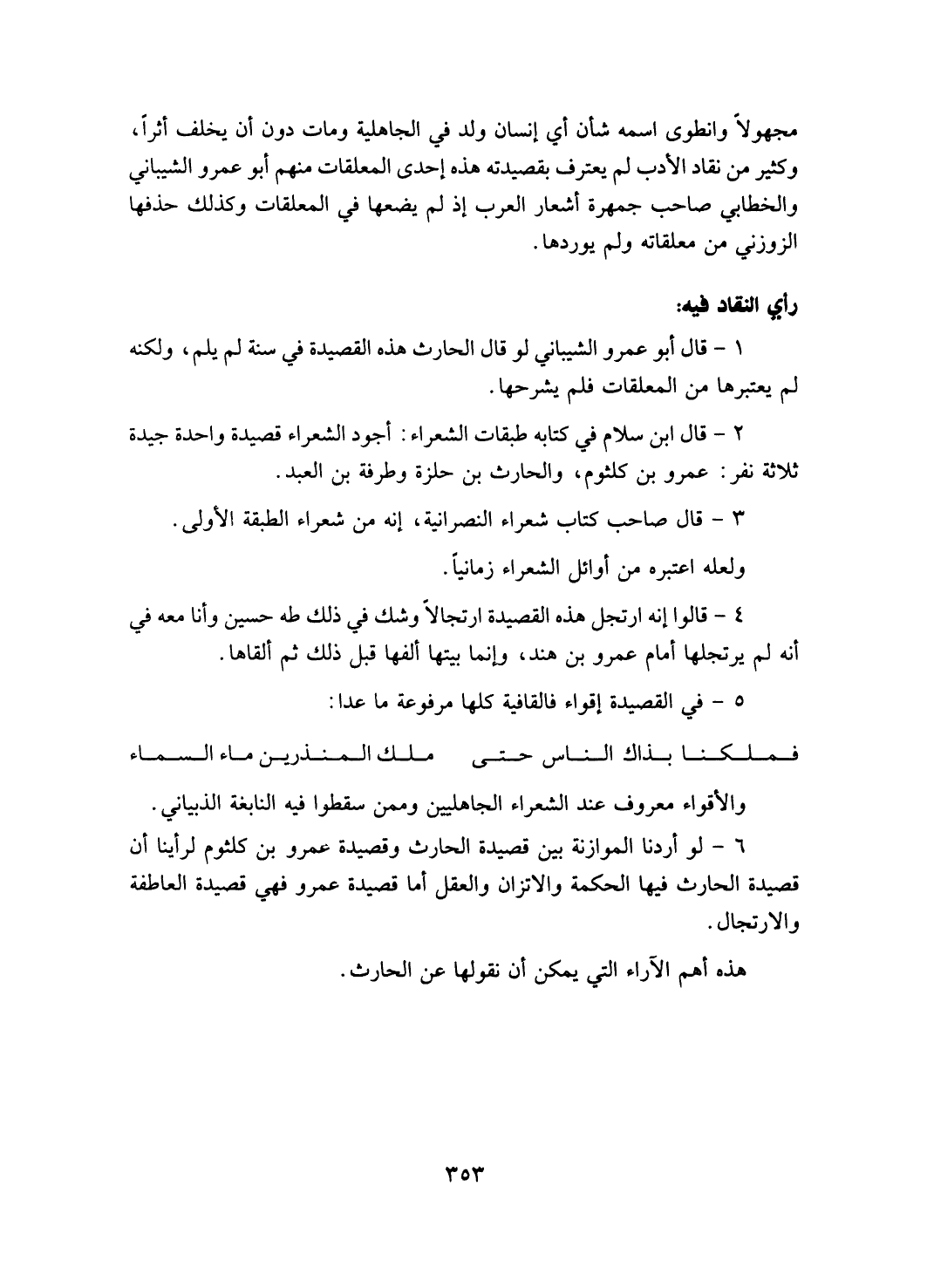 رأي النقاد فيه: 1- قال أبو عمرو الشيباني لو قال الحارث هذه القصيدة في سنة لم يلم، ولكنه لم يعتبرها من المعلقات فلم يشرحها.
