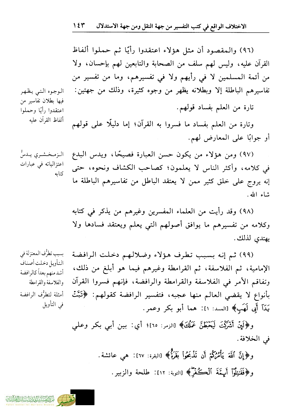 (98) وقد رأيت من العلماء المفسرين وغيرهم من يذكر في كتابه وكلامه من تفسيرهم ما يوافق أصولهم التي يعلم ويعتقد فسادها ولا يهتدي لذلك.