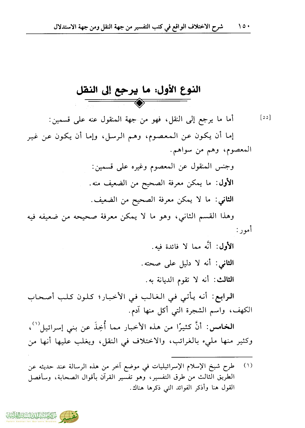 (¬1) طرح شيخ الإسلام الإسرائيليات في موضع آخر من هذه الرسالة عند حديثه عن الطريق الثالث من طرق التفسير، وهو تفسير القرآن بأقوال الصحابة، وسأفصل القول هنا وأذكر الفوائد التي ذكرها هناك.