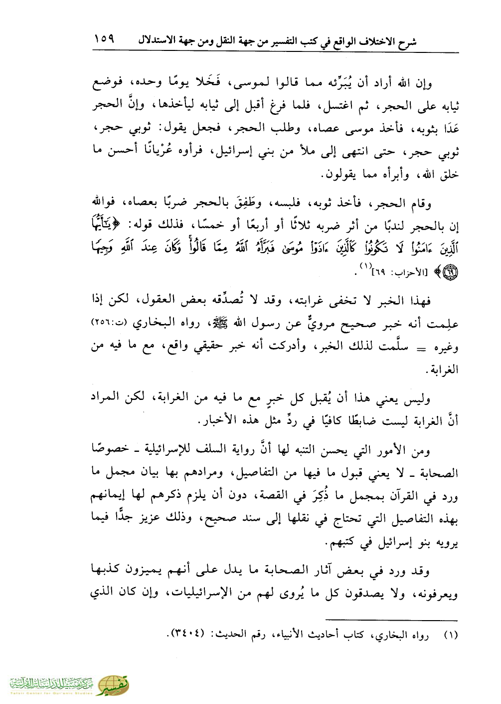 وقام الحجر، فأخذ ثوبه، فلبسه، وطَفِقَ بالحجر ضربًا بعصاه، فوالله إن بالحجر لندبًا من أثر ضربه ثلاثًا أو أربعًا أو خمسًا، فذلك قوله: {يَاأَيُّهَا الَّذِينَ آمَنُوا لاَ تَكُونُوا كَالَّذِينَ آذَوْا مُوسَى فَبَرَّأَهُ اللَّهُ مِمَّا قَالُوا وَكَانَ عِنْدَ اللَّهِ وَجِيهًا} [الأحزاب: 69] (¬1).