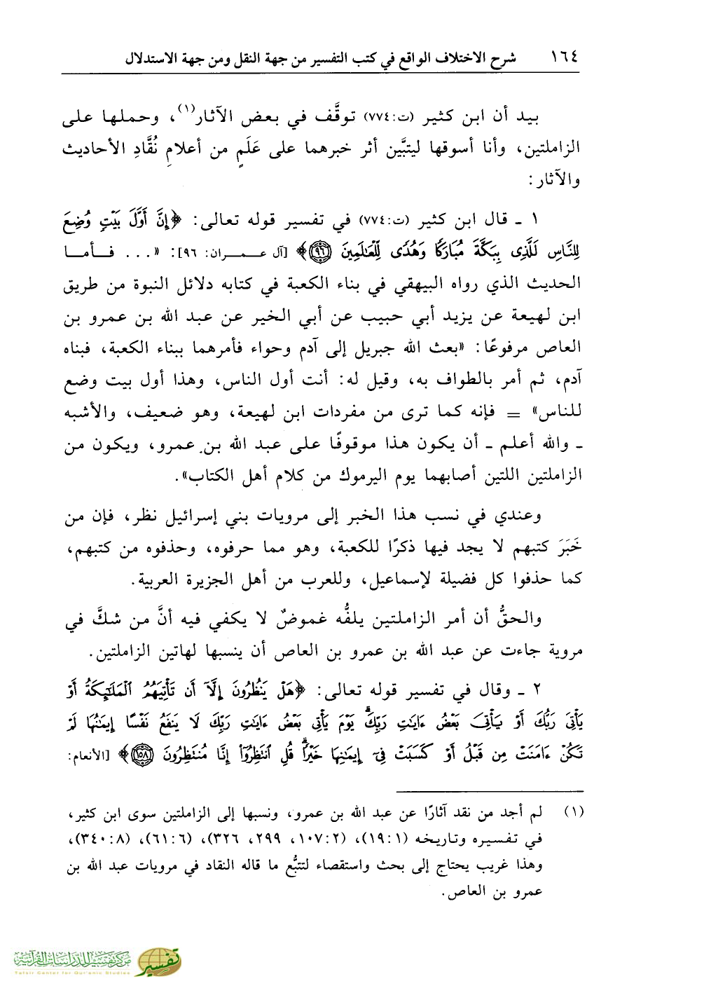 (¬1) لم أجد من نقد آثارًا عن عبد الله بن عمرو، ونسبها إلى الزاملتين سوى ابن كثير، في تفسيره وتاريخه (1:19)، (2:107، 299، 326)، (6:61)، (8:340)، وهذا غريب يحتاج إلى بحث واستقصاء لتتبُّع ما قاله النقاد في مرويات عبد الله بن عمرو بن العاص.