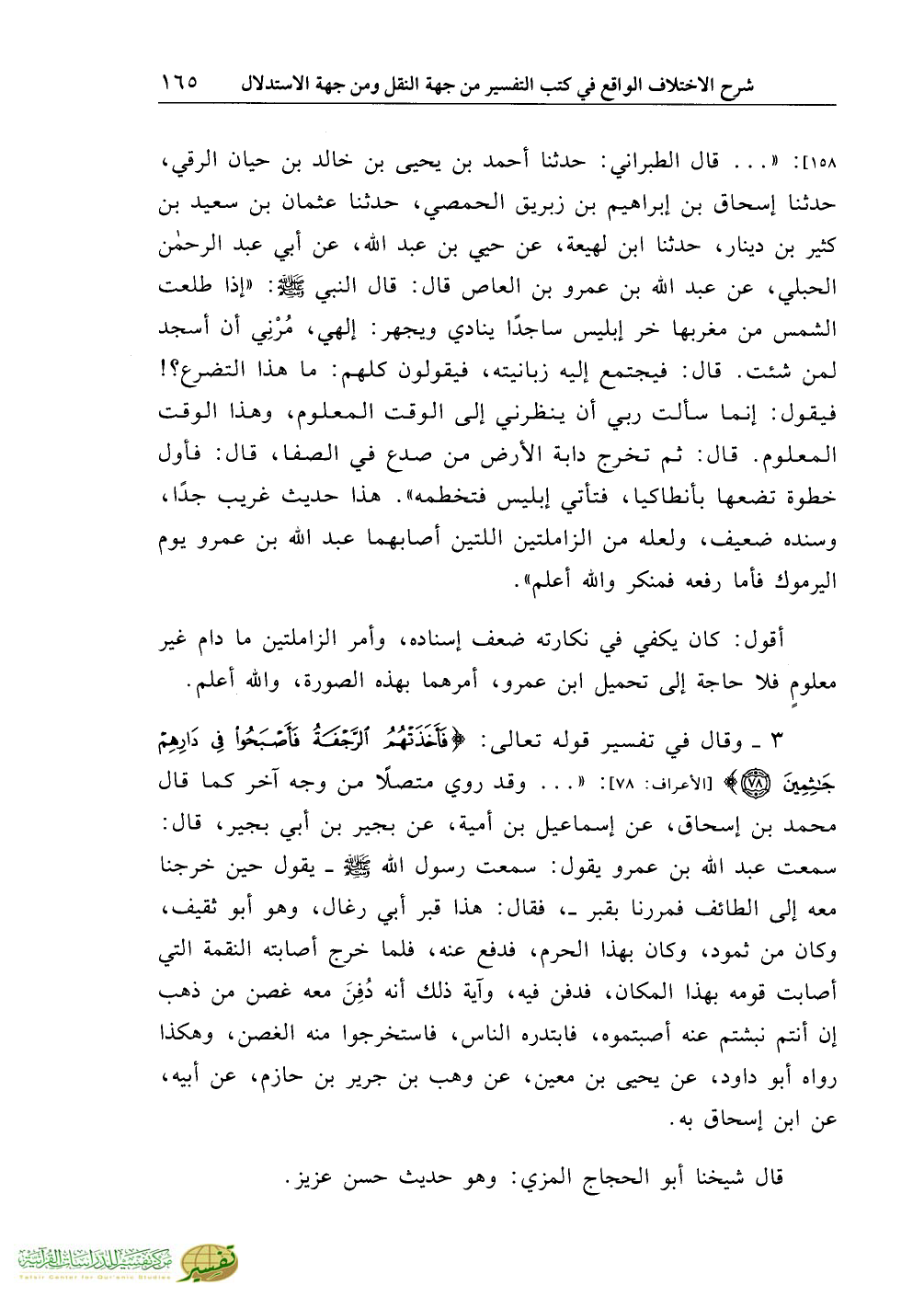 3 - وقال في تفسير قوله تعالى: {فَأَخَذَتْهُمُ الرَّجْفَةُ فَأَصْبَحُوا فِي دَارِهِمْ جَاثِمِينَ} [الأعراف: 78]: «... وقد روي متصلاً من وجه آخر كما قال محمد بن إسحاق، عن إسماعيل بن أمية، عن بجير بن أبي بجير، قال: سمعت عبد الله بن عمرو يقول: سمعت رسول الله صلّى الله عليه وسلّم ـ يقول حين خرجنا معه إلى الطائف فمررنا بقبر ـ، فقال: هذا قبر أبي رغال، وهو أبو ثقيف، وكان من ثمود، وكان بهذا الحرم، فدفع عنه، فلما خرج أصابته النقمة التي أصابت قومه بهذا المكان، فدفن فيه، وآية ذلك أنه دُفِنَ معه غصن من ذهب إن أنتم نبشتم عنه أصبتموه، فابتدره الناس، فاستخرجوا منه الغصن، وهكذا رواه أبو داود، عن يحيى بن معين، عن وهب بن جرير بن حازم، عن أبيه، عن ابن إسحاق به.