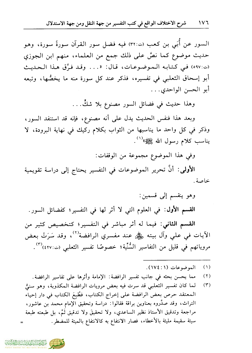 وقد أشار إلى بعض كتب التفسير التي تحوي شيئًا من هذه الموضوعات، وهي: تفسير الثعلبي (ت:427)، وتفسير الواحدي (ت:468)، وتفسير الزمخشري (ت:538)، وهذه الكتب الثلاثة تروي حديثًا في فضائل السور عن أُبَي بن كعب (ت:32) فيه فضل سور القرآن سورةً سورة، وهو حديث موضوع كما نصَّ على ذلك جمع من العلماء، منهم ابن الجوزي (ت:597) في كتابه الموضوعات، قال: «... وقد فرَّق هذا الحديث أبو إسحاق الثعلبي في تفسيره، فذكر عند كل سورة منه ما يخصُّها، وتبعه أبو الحسن الواحدي ...