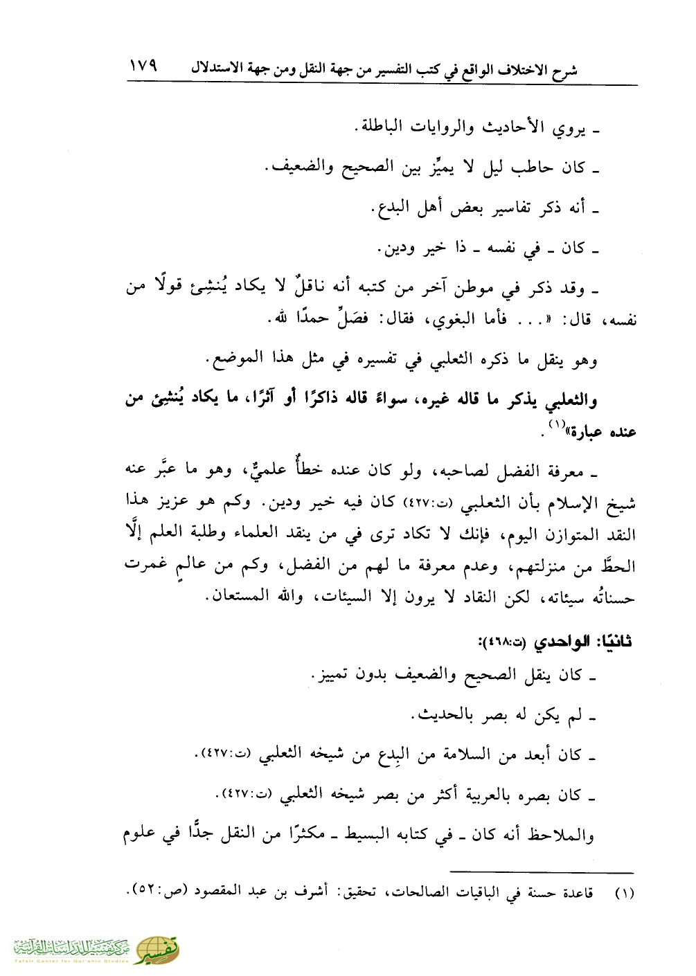 ـ معرفة الفضل لصاحبه، ولو كان عنده خطأٌ علميٌّ، وهو ما عبَّر عنه شيخ الإسلام بأن الثعلبي (ت:427) كان فيه خير ودين. وكم هو عزيز هذا النقد المتوازن اليوم، فإنك لا تكاد ترى في من ينقد العلماء وطلبة العلم إلاَّ الحطَّ من منزلتهم، وعدم معرفة ما لهم من الفضل، وكم من عالمٍ غمرت حسناتُه سيئاته، لكن النقاد لا يرون إلا السيئات، والله المستعان.