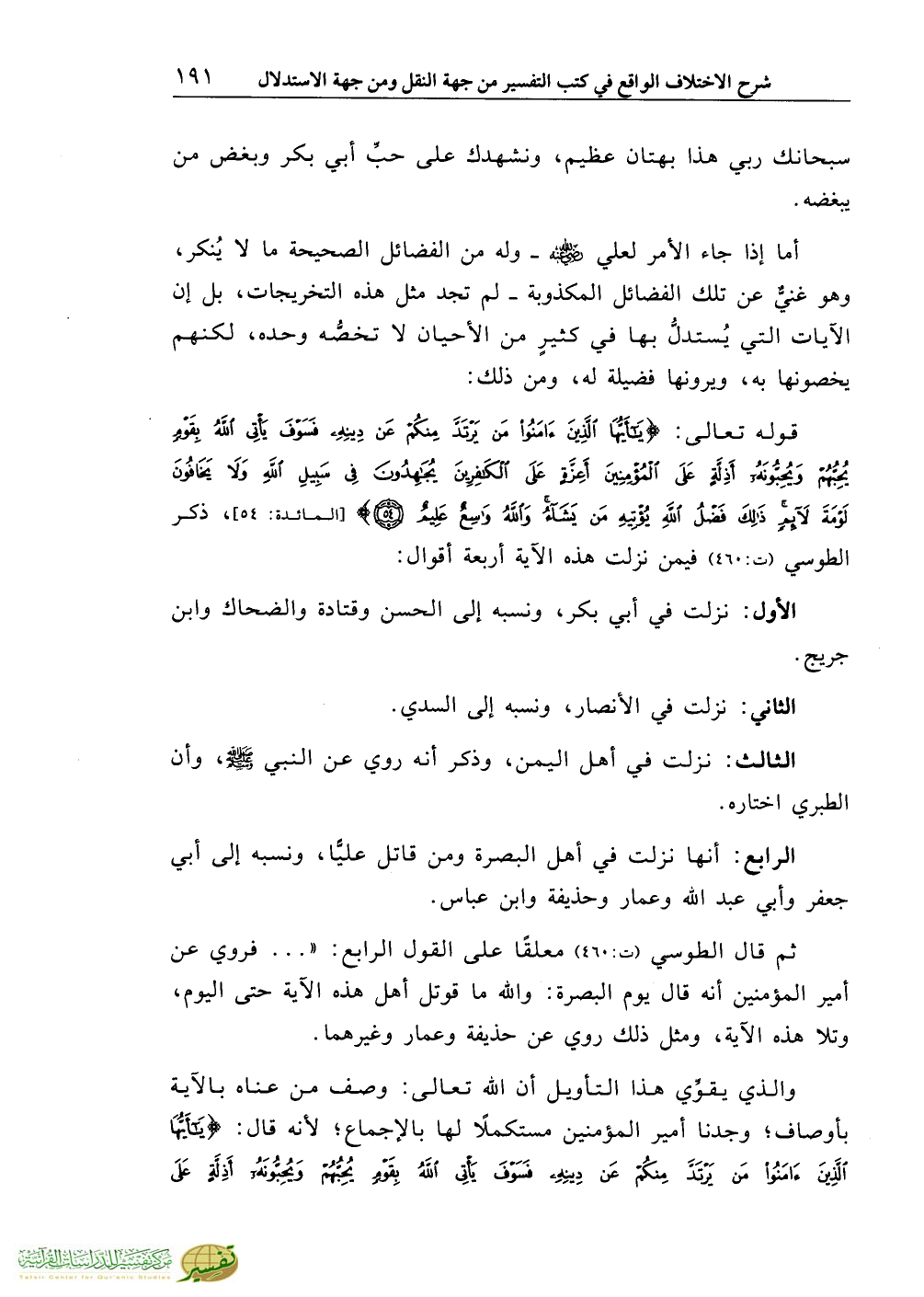 قوله تعالى: {يَاأَيُّهَا الَّذِينَ آمَنُوا مَنْ يَرْتَدَّ مِنْكُمْ عَنْ دِينِهِ فَسَوْفَ يَاتِي اللَّهُ بِقَوْمٍ يُحِبُّهُمْ وَيُحِبُّونَهُ أَذِلَّةٍ عَلَى الْمُؤْمِنِينَ أَعِزَّةٍ عَلَى الْكَافِرِينَ يُجَاهِدُونَ فِي سَبِيلِ اللَّهِ وَلاَ يَخَافُونَ لَوْمَةَ لاَئِمٍ ذَلِكَ فَضْلُ اللَّهِ يُؤْتِيهِ مَنْ يَشَاءُ وَاللَّهُ وَاسِعٌ عَلِيمٌ} [المائدة: 54]، ذكر الطوسي (ت:460) فيمن نزلت هذه الآية أربعة أقوال:
