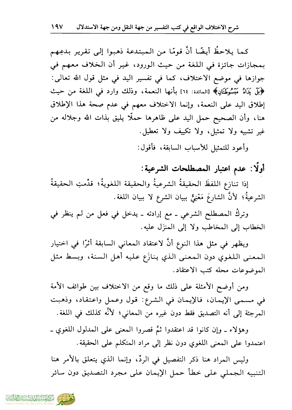 ويظهر في مثل هذا النوع أنَّ لاعتقاد المعاني السابقة أثرًا في اختيار المعنى اللغوي دون المعنى الذي ينازَع عليه أهل السنة، وبسط مثل الموضوعات محله كتب الاعتقاد.
