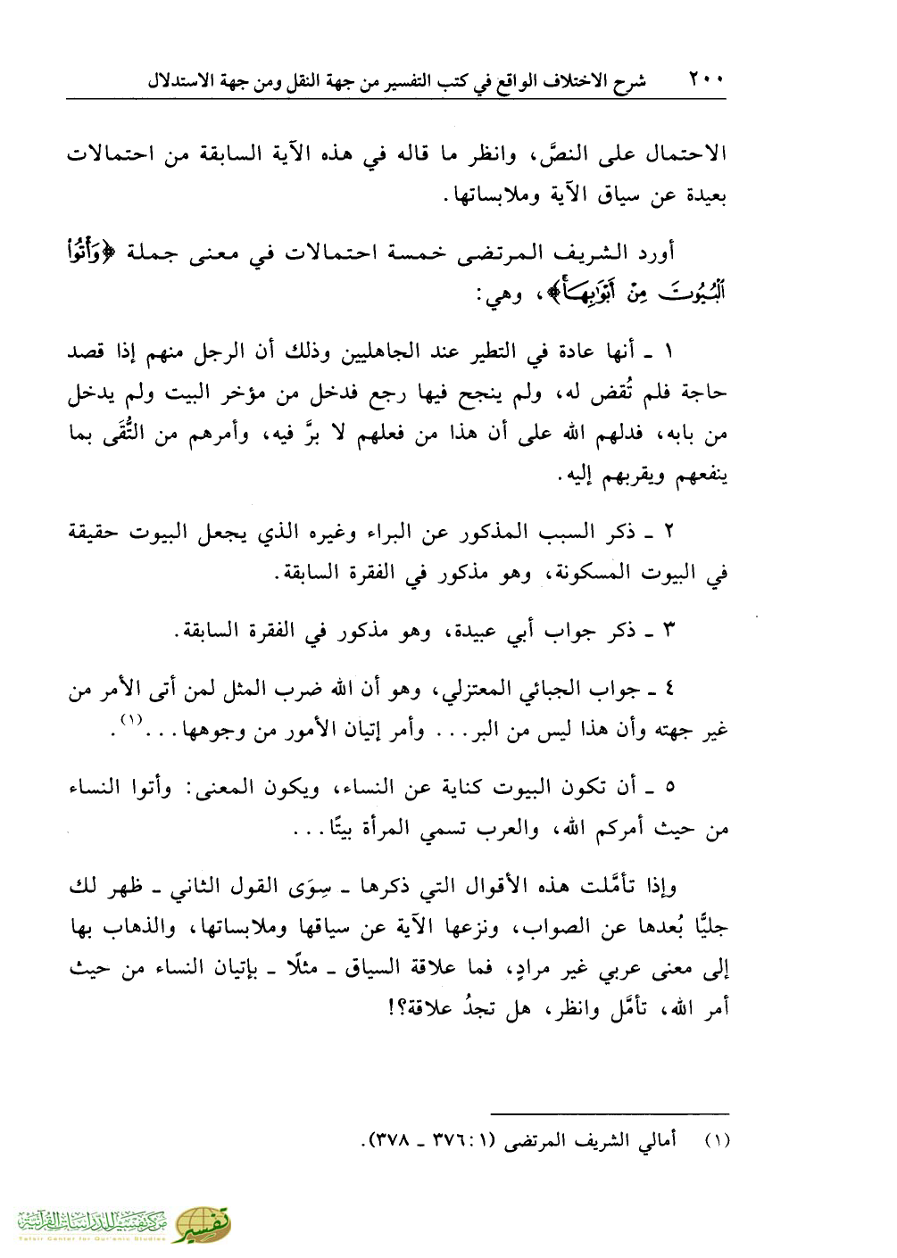 أورد الشريف المرتضى خمسة احتمالات في معنى جملة {وَاتُوا الْبُيُوتَ مِنْ أَبْوَابِهَا}، وهي: