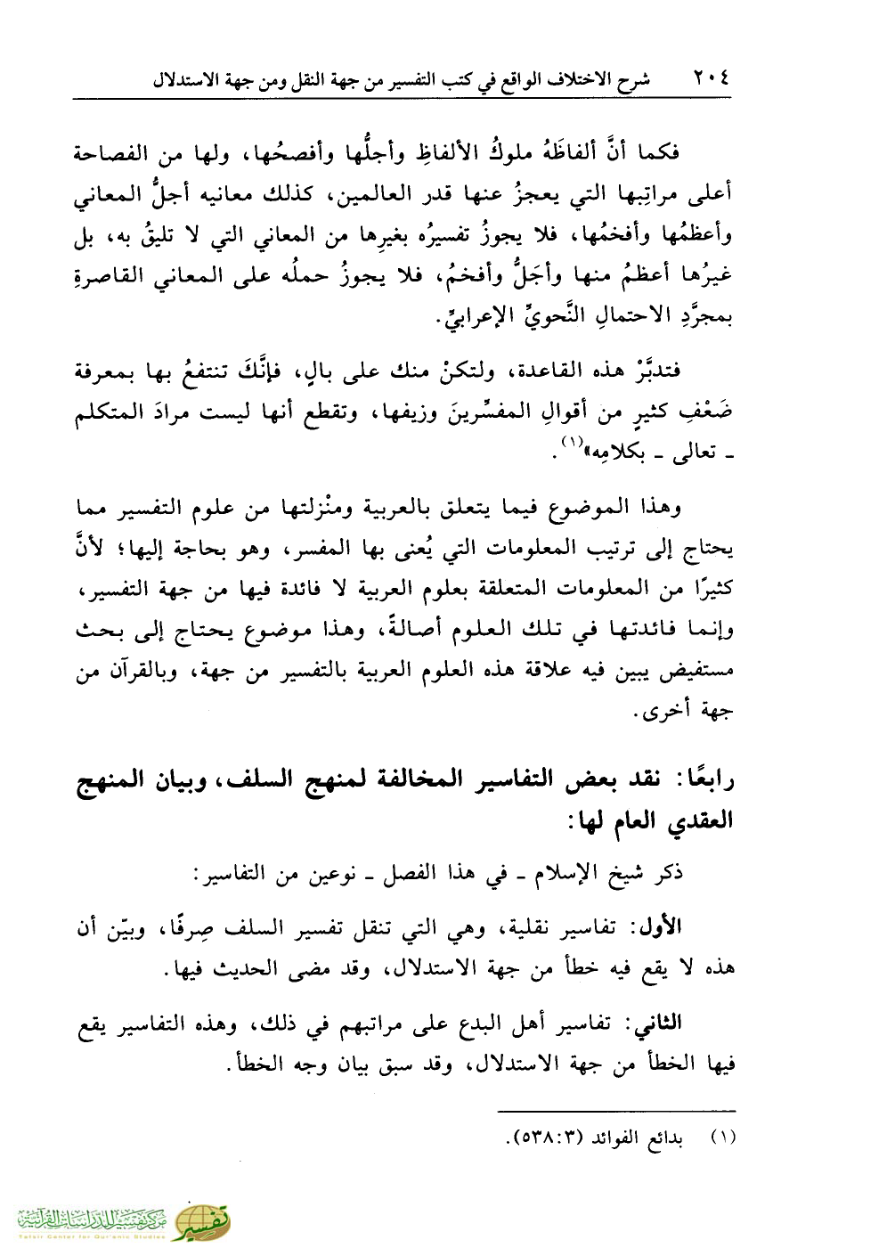 الأول: تفاسير نقلية، وهي التي تنقل تفسير السلف صِرفًا، وبيّن أن هذه لا يقع فيه خطأ من جهة الاستدلال، وقد مضى الحديث فيها.