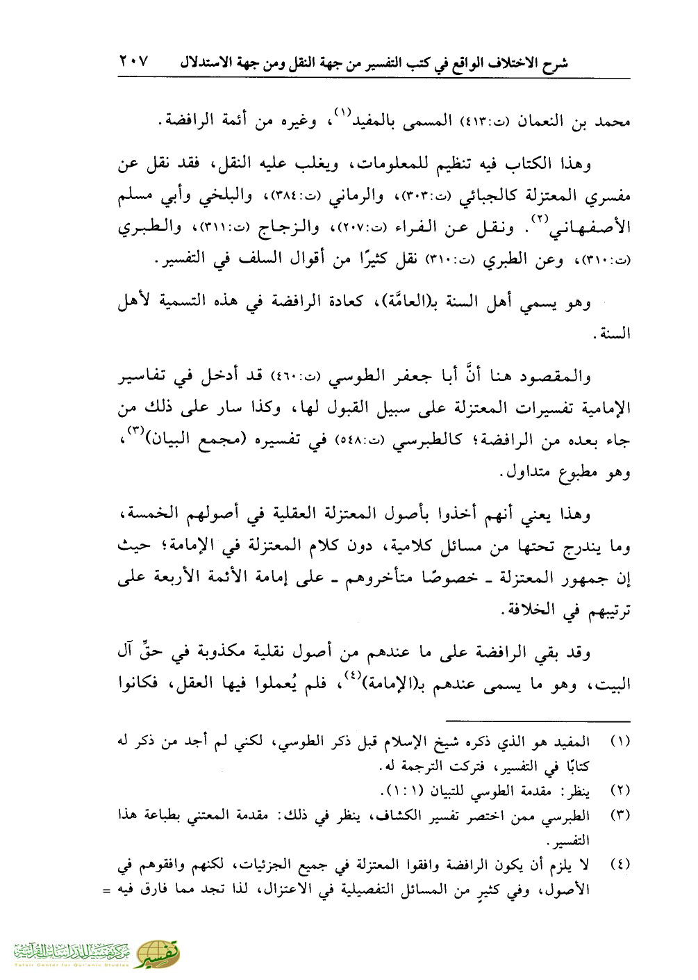 والمقصود هنا أنَّ أبا جعفر الطوسي (ت:460) قد أدخل في تفاسير الإمامية تفسيرات المعتزلة على سبيل القبول لها، وكذا سار على ذلك من جاء بعده من الرافضة؛ كالطبرسي (ت:548) في تفسيره (مجمع البيان) (¬3)، وهو مطبوع متداول.
