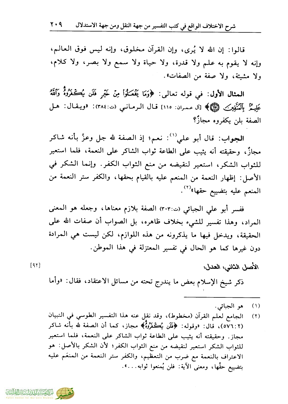 (¬2) الجامع لعلم القرآن (مخطوط)، وقد نقل عنه هذا التفسير الطوسي في التبيان (2:576)، قال: «وقوله: {فَلَنْ يُكْفَرُوهُ} مجاز، كما أن الصفة لله بأنه شاكر مجاز. وحقيقته أنه يثيب على الطاعة ثواب الشاكر على النعمة، فلما استعير للثواب الشكر استعير لنقيضه من منع الثواب الكفر؛ لأن الشكر بالأصل: هو الاعتراف بالنعمة مع ضرب من التعظيم، والكفر ستر النعمة من المنعَم عليه بتضييع حقِّها، ومعنى الآية: فلن يُمنعوا ثوابه ...».