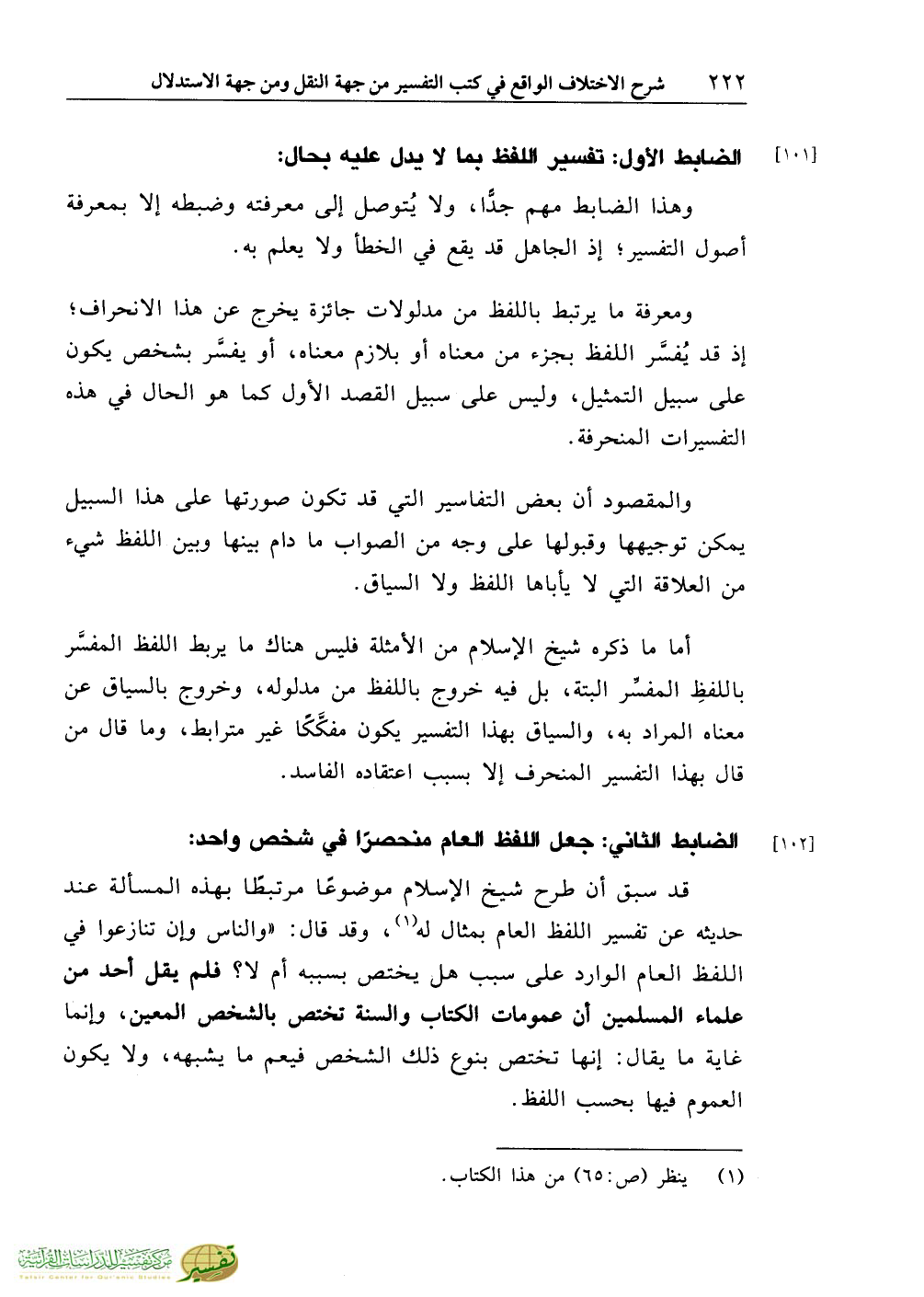 وهذا الضابط مهم جدًّا، ولا يُتوصل إلى معرفته وضبطه إلا بمعرفة أصول التفسير؛ إذ الجاهل قد يقع في الخطأ ولا يعلم به.