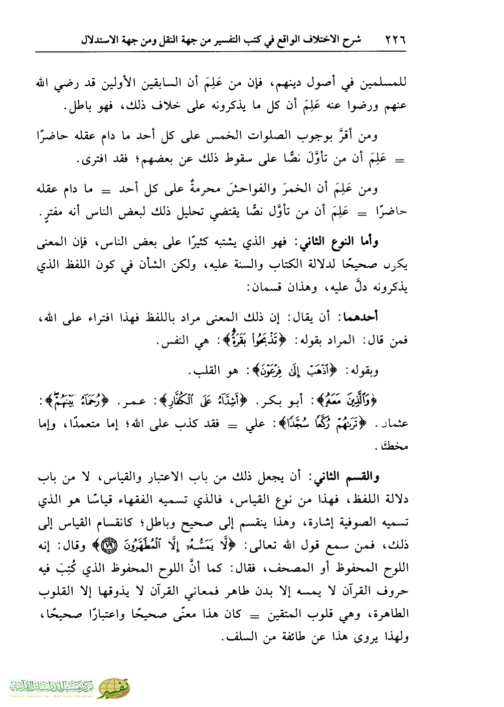 والقسم الثاني: أن يجعل ذلك من باب الاعتبار والقياس، لا من باب دلالة اللفظ، فهذا من نوع القياس، فالذي تسميه الفقهاء قياسًا هو الذي تسميه الصوفية إشارة، وهذا ينقسم إلى صحيح وباطل؛ كانقسام القياس إلى ذلك، فمن سمع قول الله تعالى: {لاَ يَمَسُّهُ إِلاَّ الْمُطَهَّرُونَ} وقال: إنه اللوح المحفوظ أو المصحف، فقال: كما أنَّ اللوح المحفوظ الذي كُتِبَ فيه حروف القرآن لا يمسه إلا بدن طاهر فمعاني القرآن لا يذوقها إلا القلوب الطاهرة، وهي قلوب المتقين = كان هذا معنًى صحيحًا واعتبارًا صحيحًا، ولهذا يروى هذا عن طائفة من السلف.