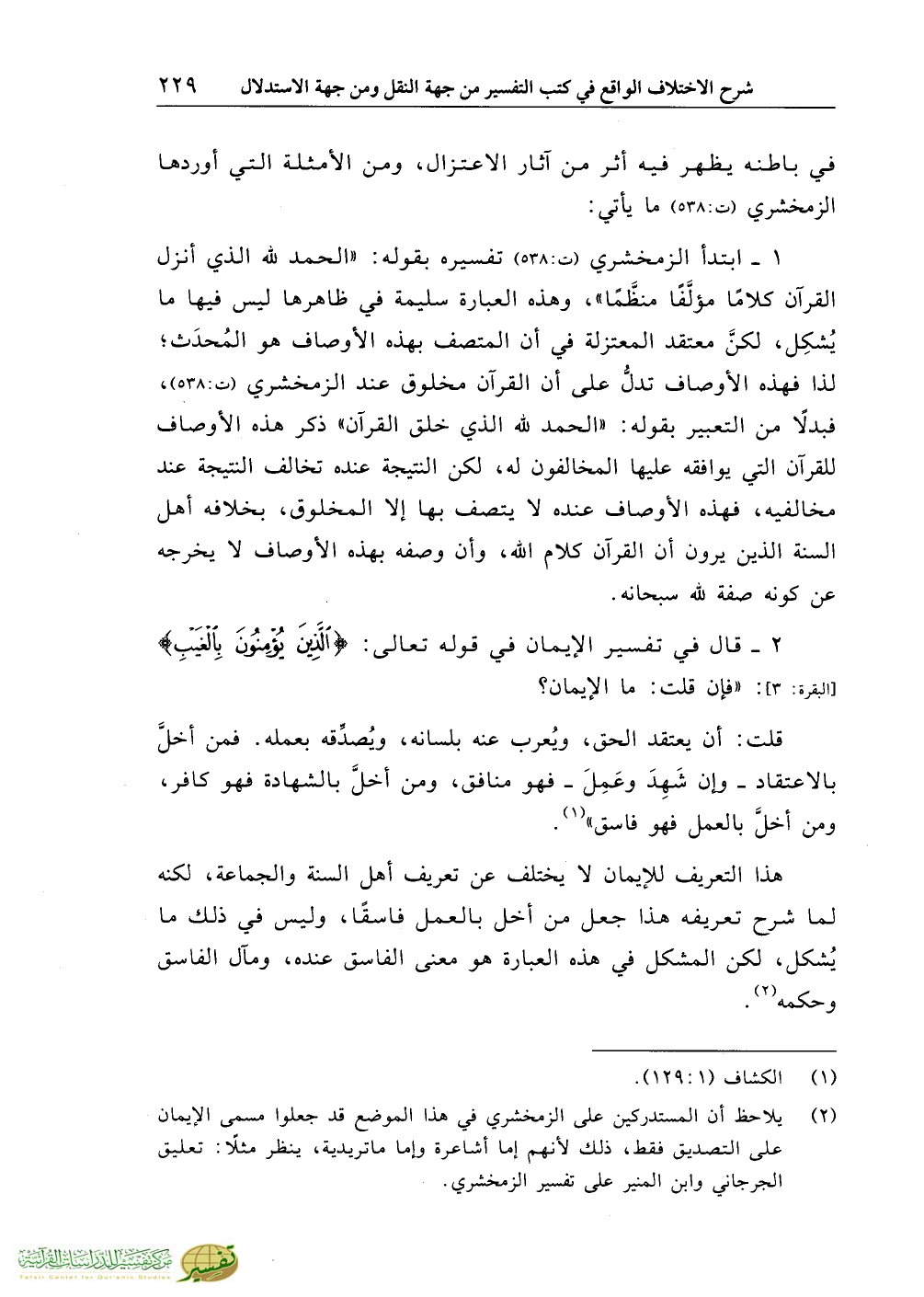 (¬2) يلاحظ أن المستدركين على الزمخشري في هذا الموضع قد جعلوا مسمى الإيمان على التصديق فقط، ذلك لأنهم إما أشاعرة وإما ماتريدية، ينظر مثلاً: تعليق الجرجاني وابن المنير على تفسير الزمخشري.