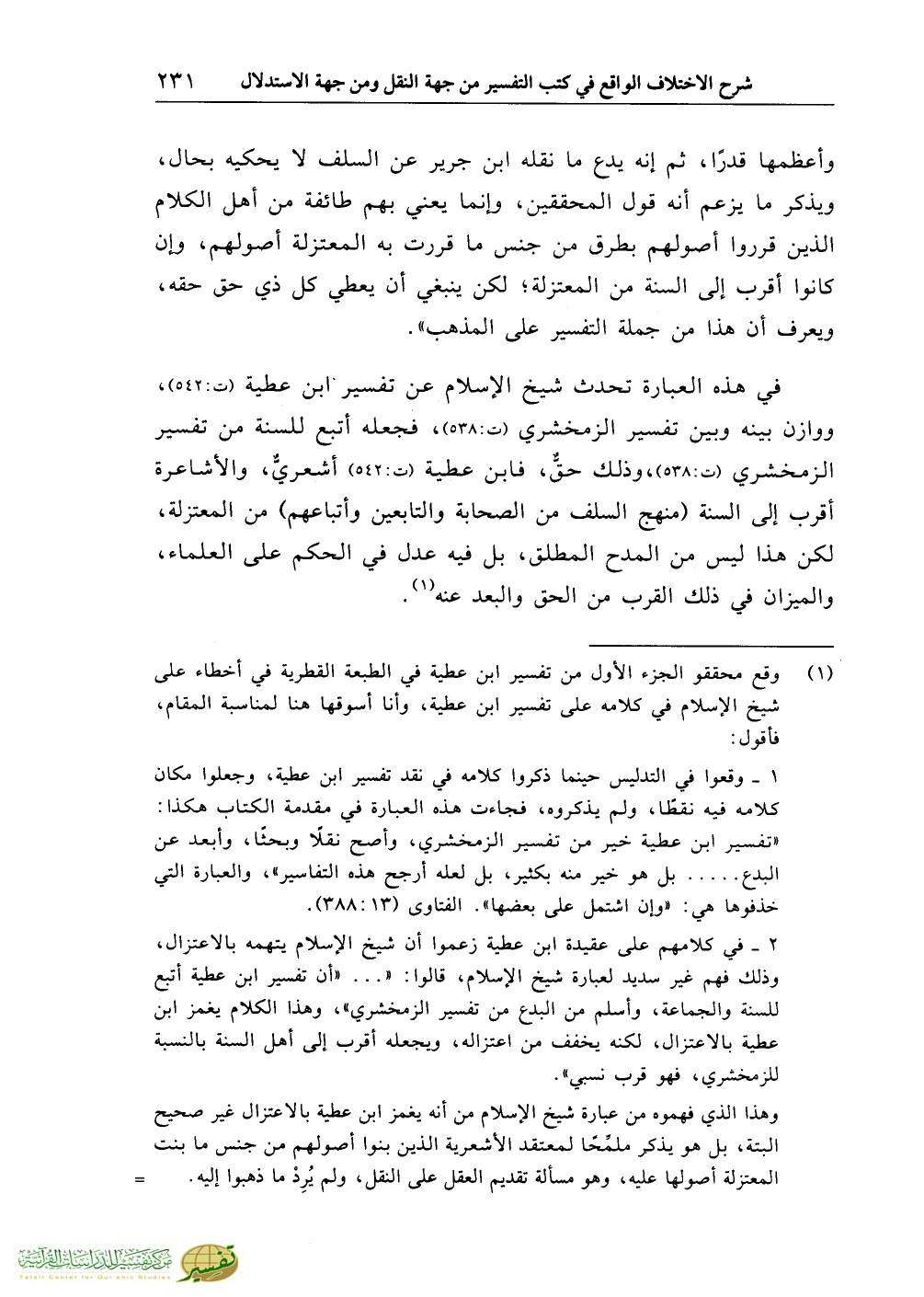 وأعظمها قدرًا، ثم إنه يدع ما نقله ابن جرير عن السلف لا يحكيه بحال، ويذكر ما يزعم أنه قول المحققين، وإنما يعني بهم طائفة من أهل الكلام الذين قرروا أصولهم بطرق من جنس ما قررت به المعتزلة أصولهم، وإن كانوا أقرب إلى السنة من المعتزلة؛ لكن ينبغي أن يعطي كل ذي حق حقه، ويعرف أن هذا من جملة التفسير على المذهب».