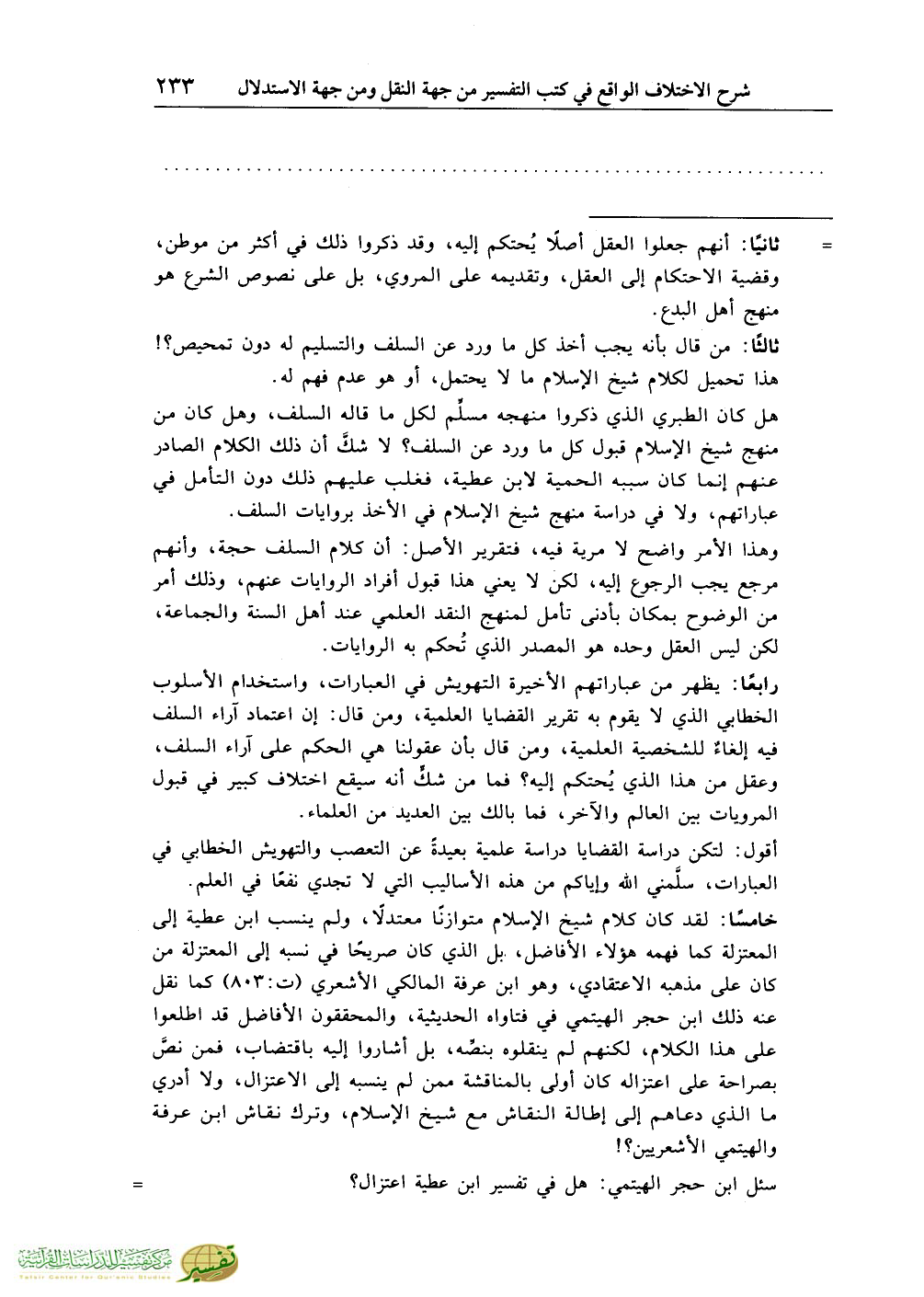 خامسًا: لقد كان كلام شيخ الإسلام متوازنًا معتدلاً، ولم ينسب ابن عطية إلى المعتزلة كما فهمه هؤلاء الأفاضل، بل الذي كان صريحًا في نسبه إلى المعتزلة من كان على مذهبه الاعتقادي، وهو ابن عرفة المالكي الأشعري (ت:803) كما نقل عنه ذلك ابن حجر الهيتمي في فتاواه الحديثية، والمحققون الأفاضل قد اطلعوا على هذا الكلام، لكنهم لم ينقلوه بنصِّه، بل أشاروا إليه باقتضاب، فمن نصَّ بصراحة على اعتزاله كان أولى بالمناقشة ممن لم ينسبه إلى الاعتزال، ولا أدري ما الذي دعاهم إلى إطالة النقاش مع شيخ الإسلام، وترك نقاش ابن عرفة والهيتمي الأشعريين؟!