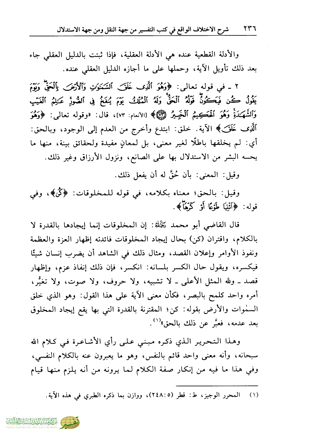 وهذا التحرير الذي ذكره مبني على رأي الأشاعرة في كلام الله سبحانه، وأنه معنى واحد قائم بالنفس، وهو ما يعبرون عنه بالكلام النفسي، وفي هذا ما فيه من إنكار صفة الكلام لما يرونه من أنه يلزم منها قيام