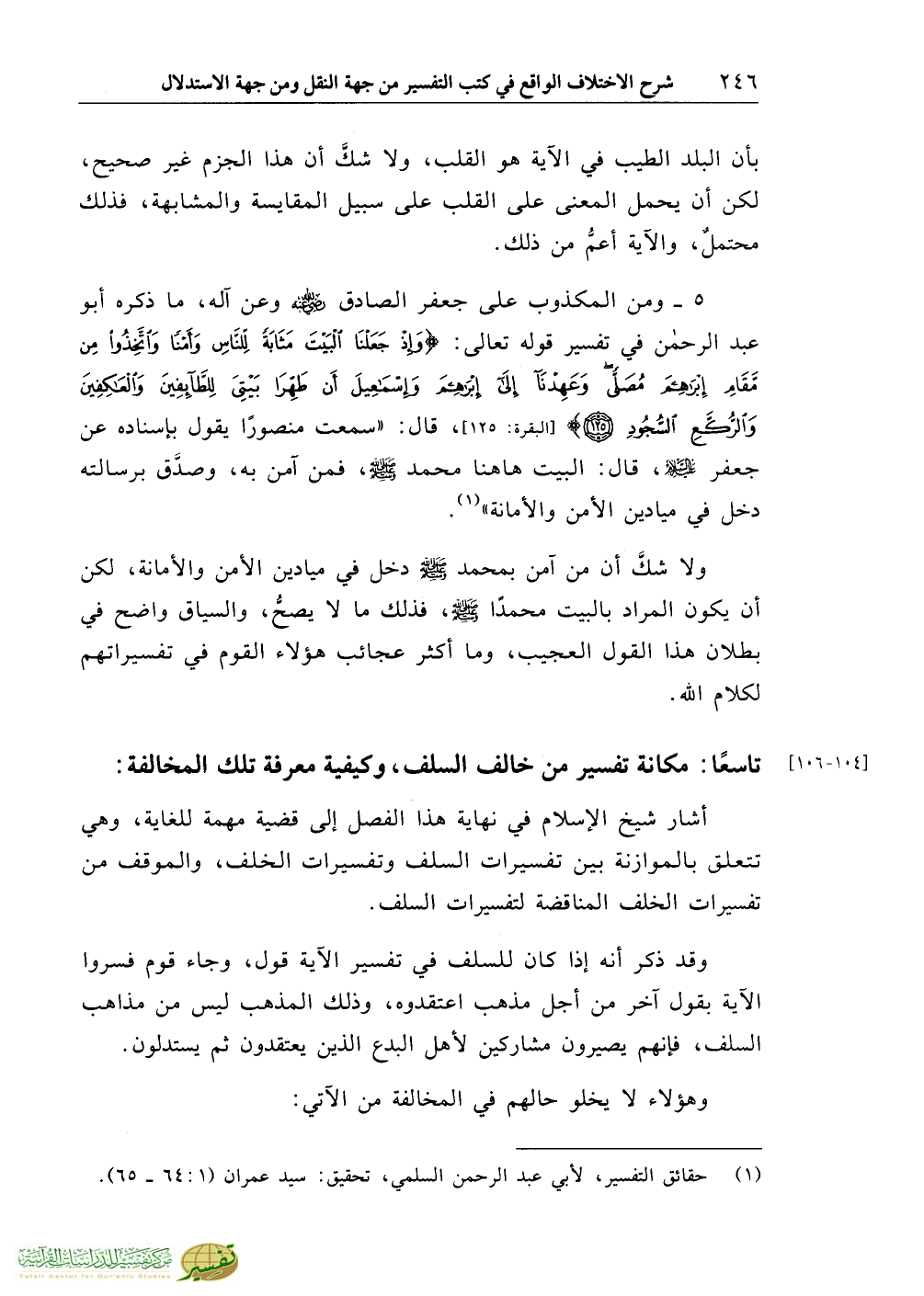 أشار شيخ الإسلام في نهاية هذا الفصل إلى قضية مهمة للغاية، وهي تتعلق بالموازنة بين تفسيرات السلف وتفسيرات الخلف، والموقف من تفسيرات الخلف المناقضة لتفسيرات السلف.