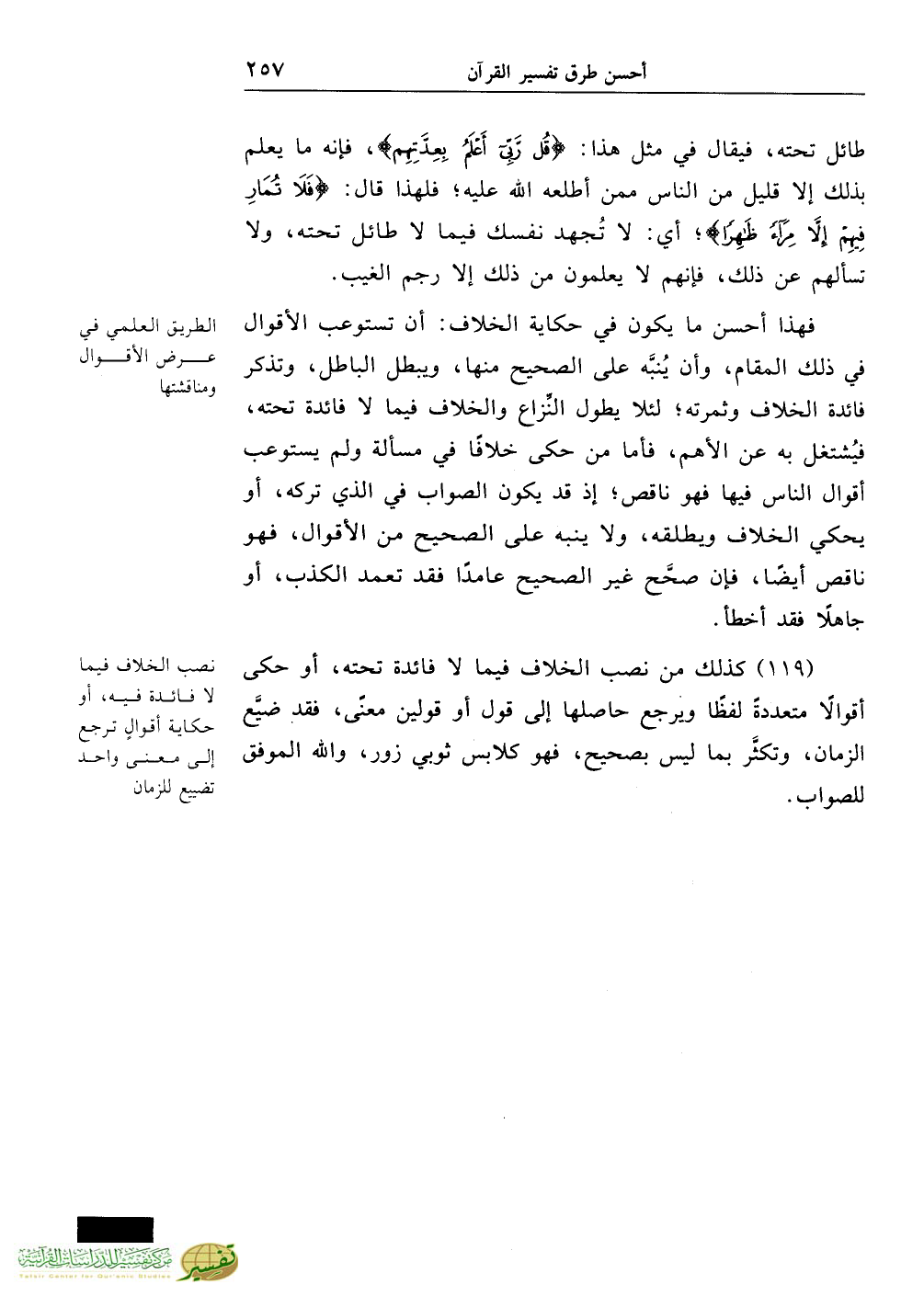 فهذا أحسن ما يكون في حكاية الخلاف: أن تستوعب الأقوال في ذلك المقام، وأن يُنبَّه على الصحيح منها، ويبطل الباطل، وتذكر فائدة الخلاف وثمرته؛ لئلا يطول النِّزاع والخلاف فيما لا فائدة تحته، فيُشتغل به عن الأهم، فأما من حكى خلافًا في مسألة ولم يستوعب أقوال الناس فيها فهو ناقص؛ إذ قد يكون الصواب في الذي تركه، أو يحكي الخلاف ويطلقه، ولا ينبه على الصحيح من الأقوال، فهو ناقص أيضًا، فإن صحَّح غير الصحيح عامدًا فقد تعمد الكذب، أو جاهلاً فقد أخطأ.