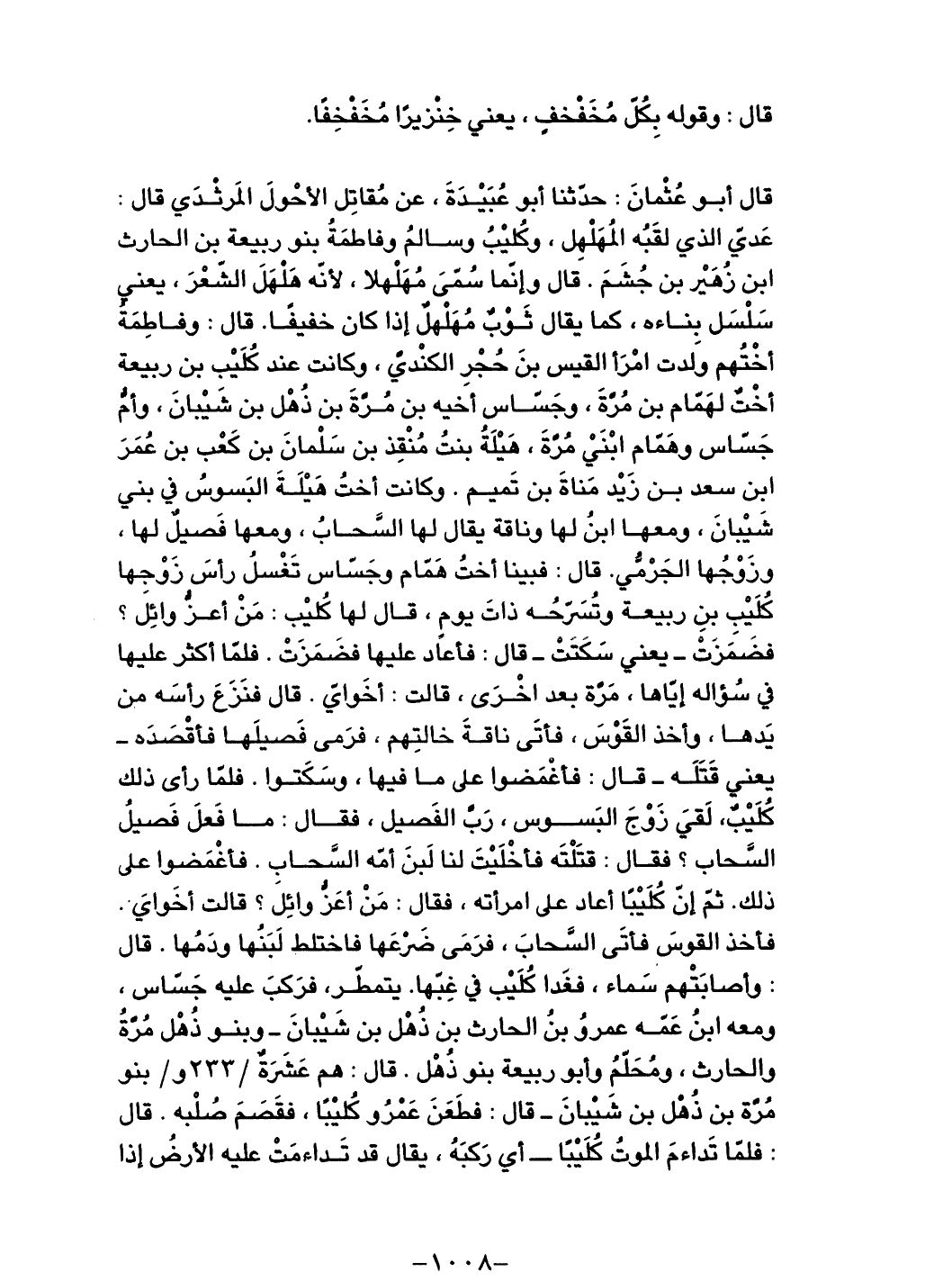ربيعة وتُسرحه ذات يوم، قال لها كليب: من أعز وائل؟ فضمزت - يعني سكتت - قال: فأعاد عليها
