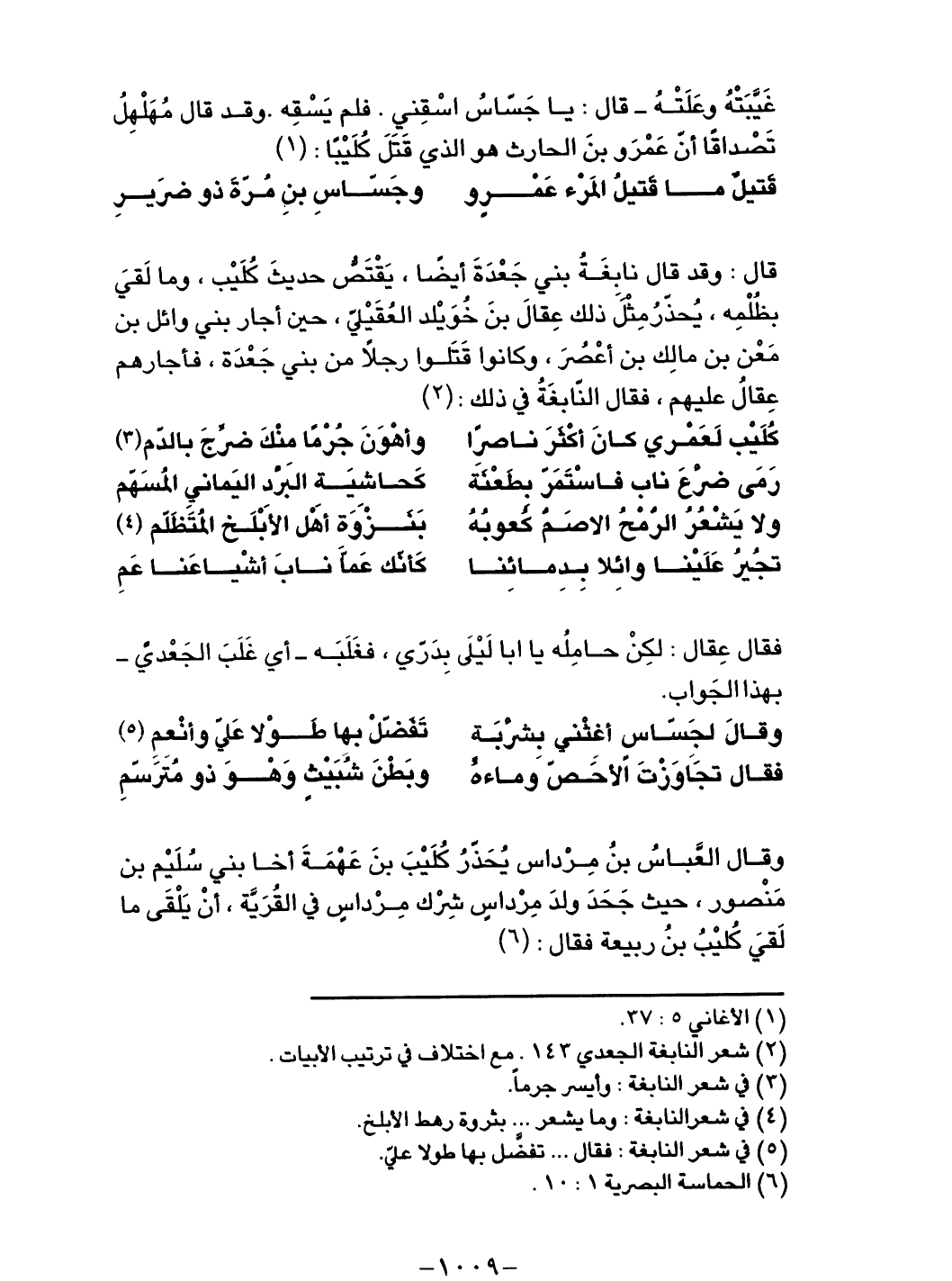 قال: وقد قال نابغة بني جعدة أيضاً، يقتص حديث كليب، وما لقي بظلمه، يحذر مثل ذلك عقال بن