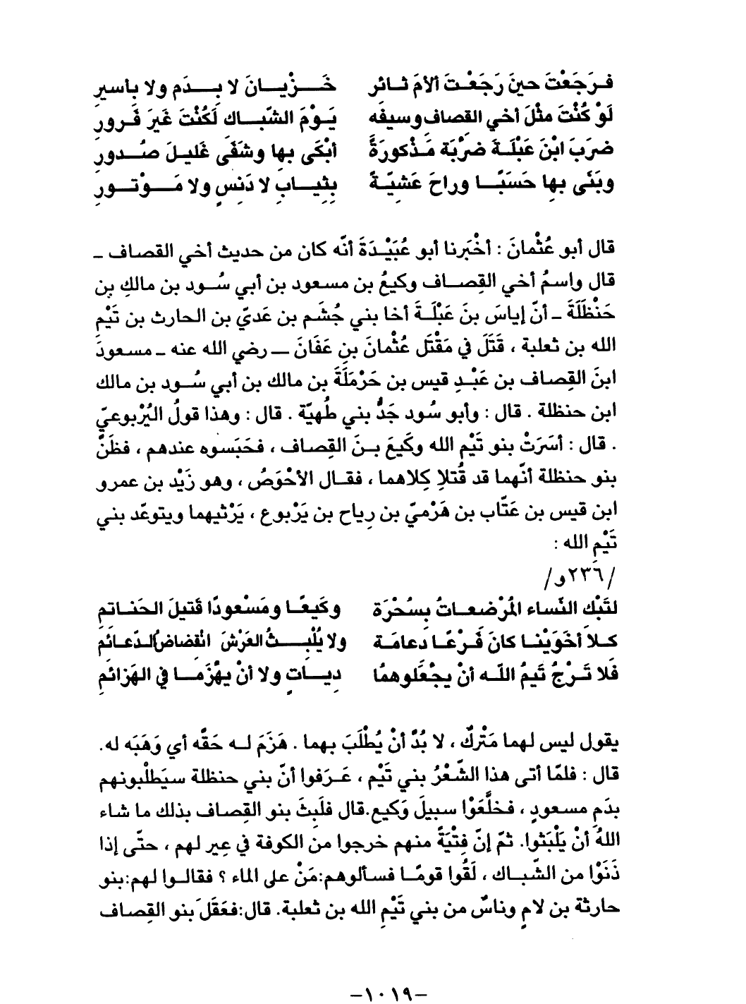 قوماً فسألوهم: من على الماء؟ فقالوا لهم: بنو حارثة بن لام وناس من بني تيم الله بن ثعلبة. قال: فعقل بنو القصاف
