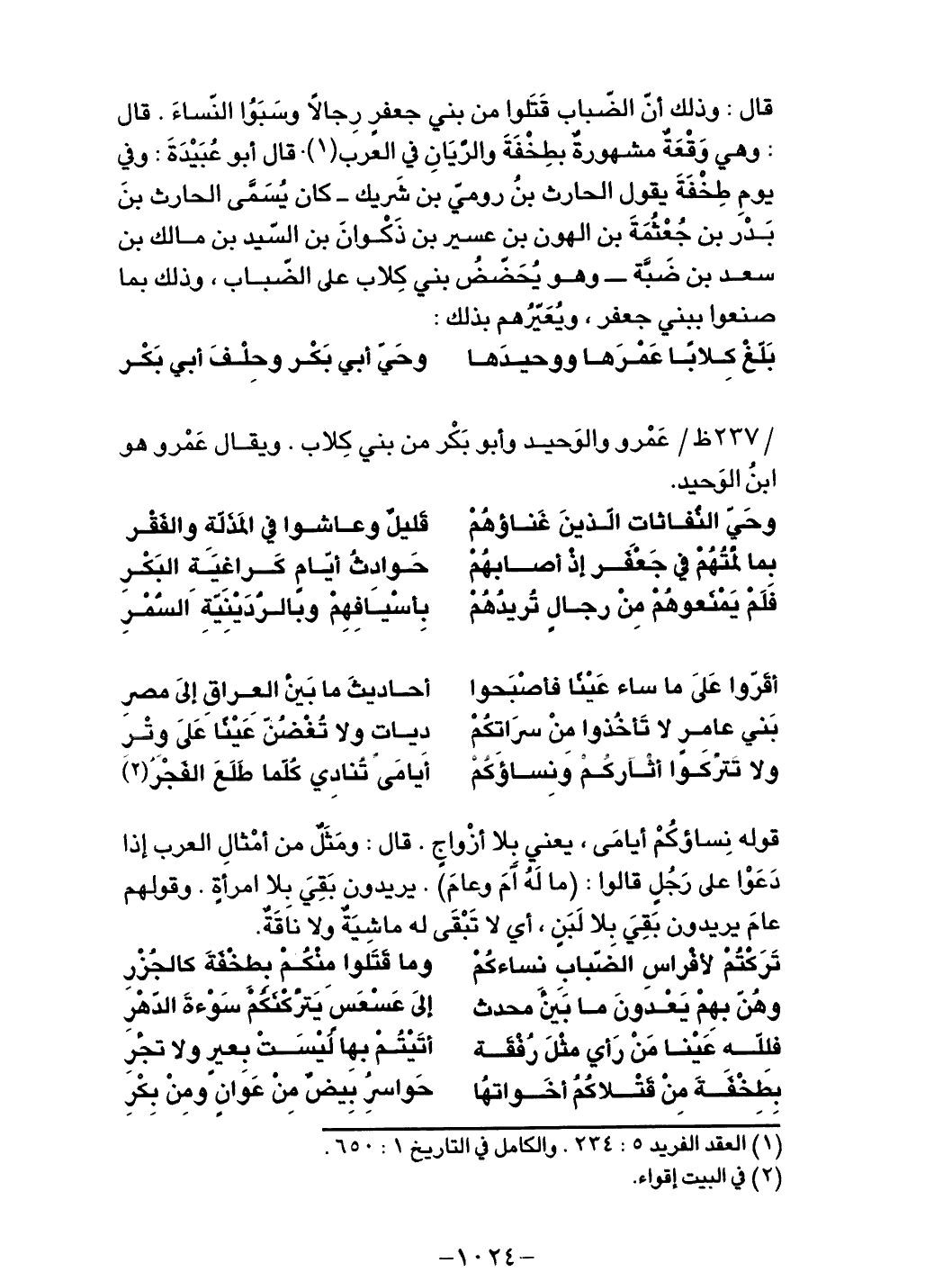 قال: وذلك أن الضباب قتلوا من بني جعفر رجالاً وسبوا النساء. قال: وهي وقعة مشهورة بطخفة